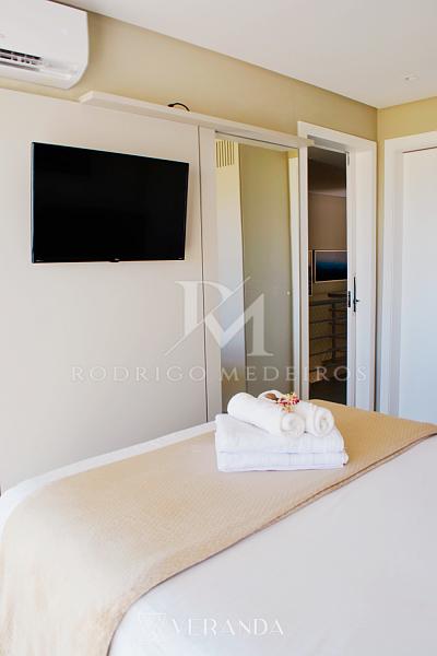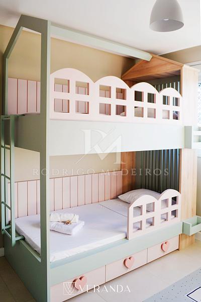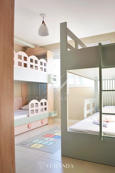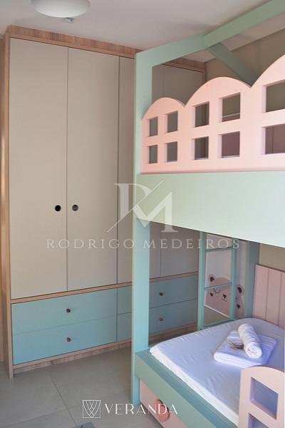 A planta foi pensada para receber bem — tanto a luz natural quanto os bons momentos. São 3 quartos, incluindo uma suíte com vista mar, um dormitório de hóspedes com cama de casal (também com vista mar), e um terceiro quarto com duas beliches que acomodam até quatro pessoas, ideal para famílias maiores ou veraneios com amigos.