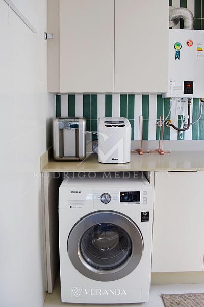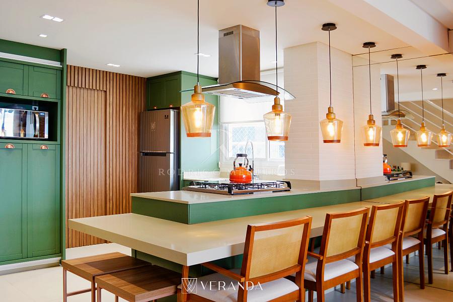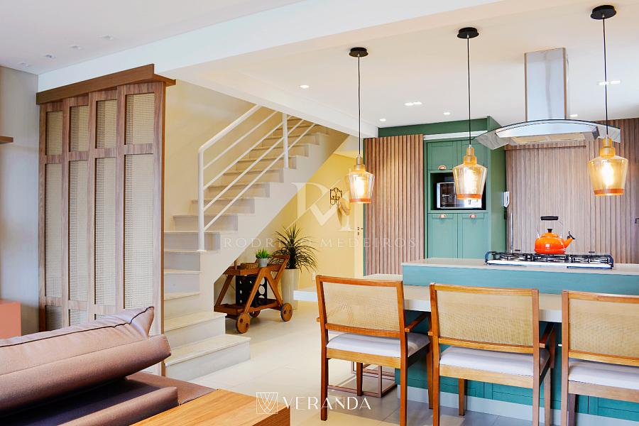 A cozinha integrada à sala favorece a convivência no dia a dia, enquanto a área gourmet com churrasqueira a carvão e vista mar se torna o espaço ideal para reunir, celebrar e contemplar o pôr do sol.