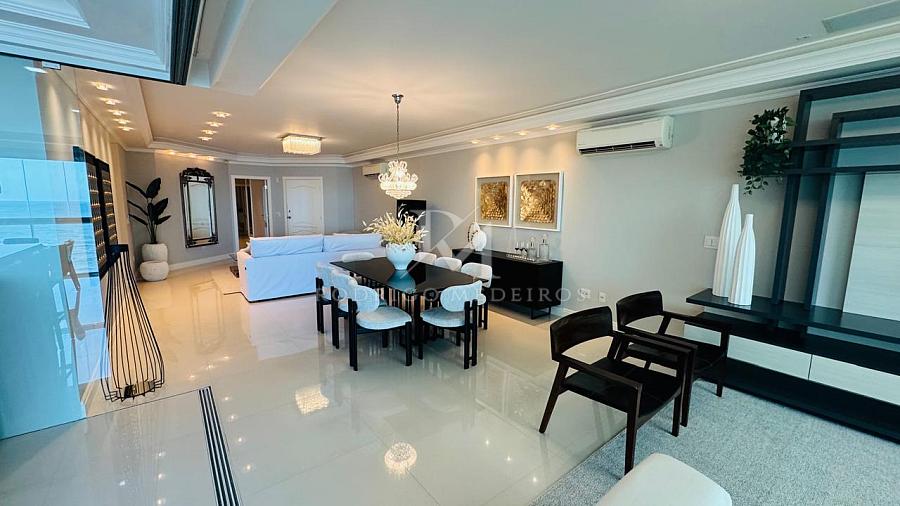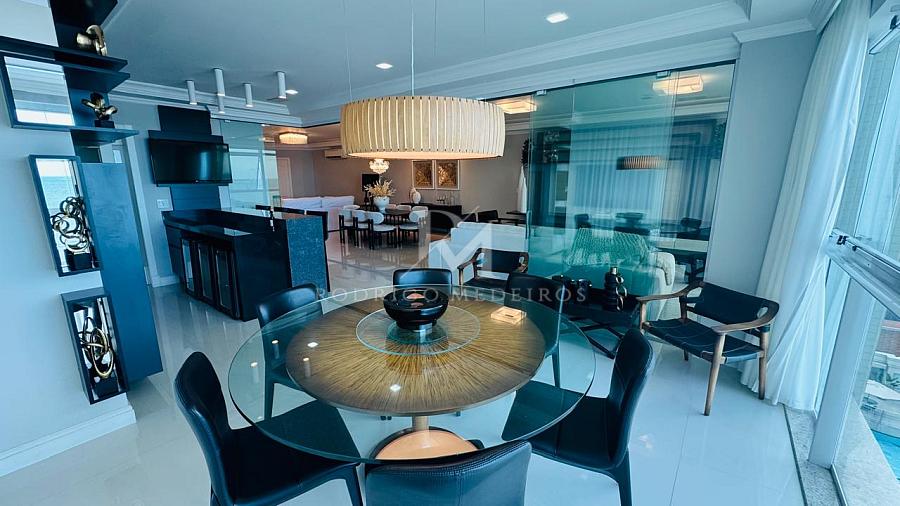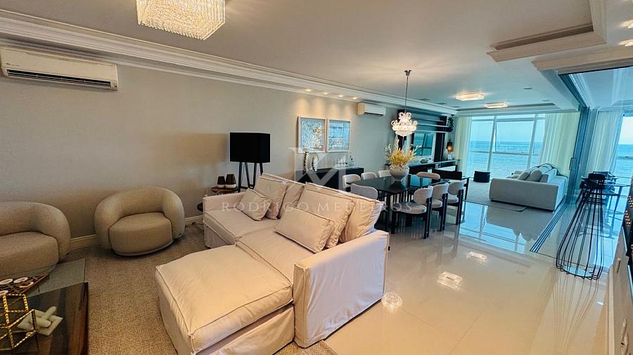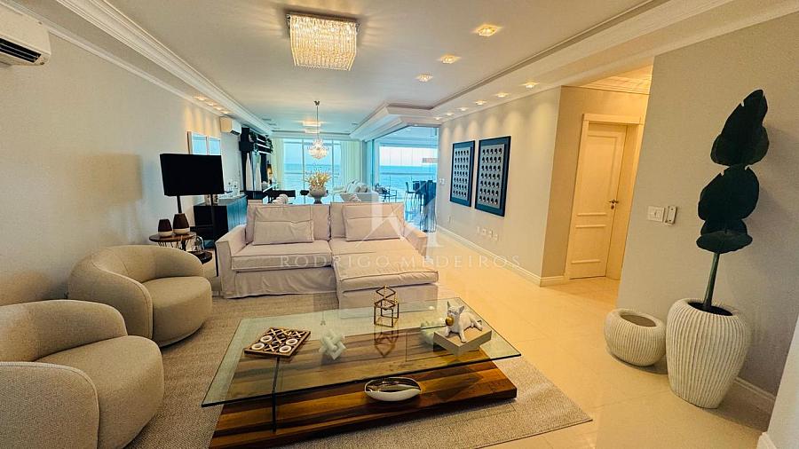 Com 281 m² de área privativa e 362,65 m² de área total, o imóvel foi cuidadosamente mobiliado e climatizado, pronto para uso imediato. A área social é generosa, integrada e naturalmente iluminada, valorizada pela vista aberta para o mar — um cenário que acompanha a rotina e transforma cada ambiente em uma experiência visual.
