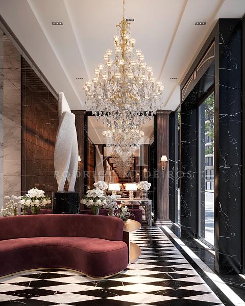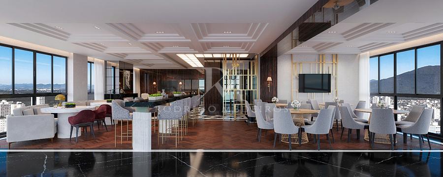 ◦ Acabamentos em mármore, madeira nobre e porcelanato de grande formato