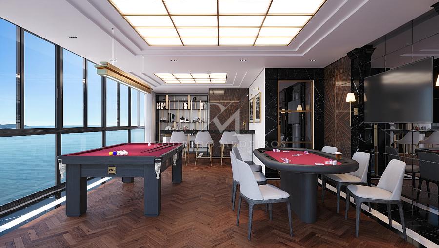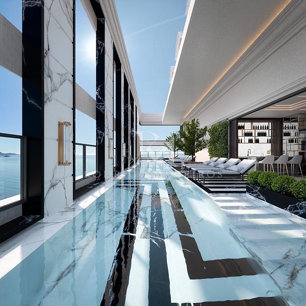 O requinte se estende às áreas comuns, com hall social decorado com mármores importados, salão de festas equipado com louçaria filetada a ouro, sala de jogos, espaço kids, academia completa, piscinas internas e externas climatizadas, bar da piscina, sauna úmida, SPA e rooftop com vista panorâmica para o mar. Tudo sonorizado, climatizado e decorado com curadoria refinada — incluindo mobiliário Sierra, Saccaro ou similar.