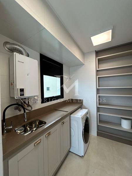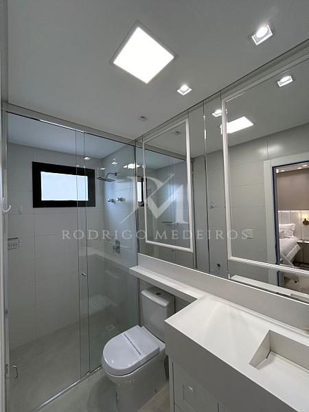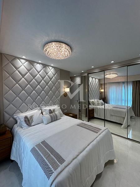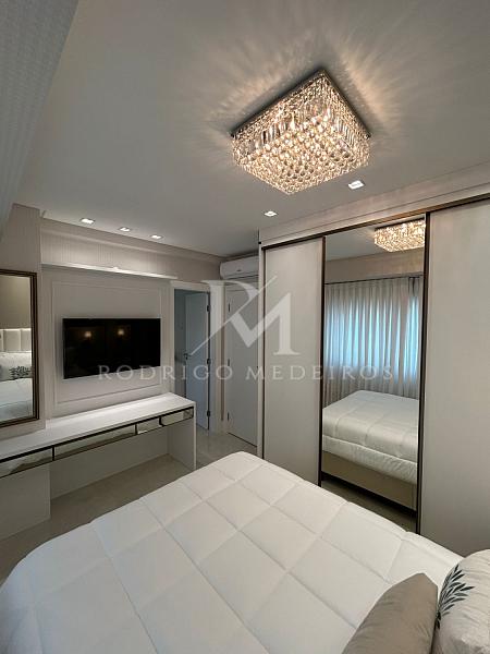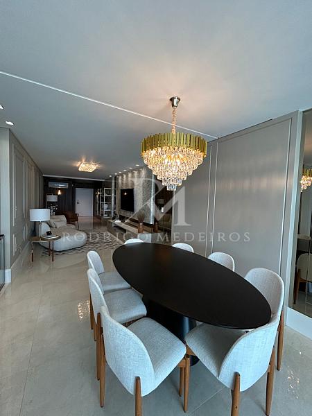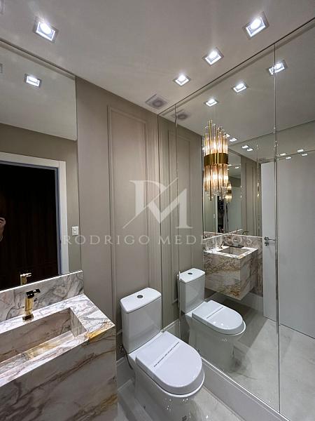 São quatro suítes bem distribuídas, garantindo conforto e privacidade. O apartamento está finamente mobiliado, com acabamento cuidadoso e soluções que valorizam estética e funcionalidade. O lavabo atende à área social com praticidade, enquanto a cozinha e a área de serviço complementam o layout de forma organizada.