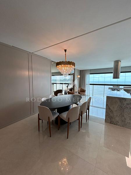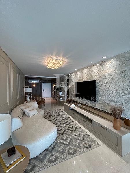 Com aproximadamente 180 m² de área privativa, o imóvel apresenta um living com sacada integrada de frente para o mar, proporcionando vista permanente e integração harmoniosa entre os ambientes. A composição do espaço favorece iluminação natural e amplitude, criando um cenário ideal para receber com elegância.