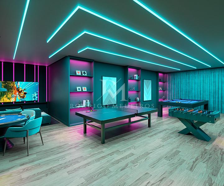 Mas é ao sair do apartamento que o projeto surpreende ainda mais. São 1.850 m² de lazer decorado, mobiliado e equipado, incluindo piscina, espaço lounge, salão de festas, academia, spa com piscina aquecida e hidromassagem, bar inglês, sala de jogos, playground, brinquedoteca e espaço pet. Tudo isso distribuído em uma área central entre as duas torres, criando um verdadeiro oásis urbano no coração de Itapema.