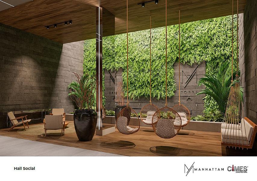 Além de conforto, o Manhattan aposta em soluções sustentáveis — captação de águas pluviais, placas fotovoltaicas, iluminação eficiente e medidores individuais estão entre os diferenciais.