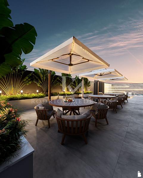Com 30 pavimentos e apenas dois apartamentos por andar, o empreendimento entrega exclusividade desde a estrutura. São 48 unidades residenciais, todas com três suítes, metragens generosas e acabamentos que refletem a sofisticação do projeto. Os apartamentos contam com living integrado, sacada gourmet com churrasqueira a carvão e sistema de exaustão, piso porcelanato nas áreas sociais, piso laminado nas áreas íntimas e infraestrutura completa para climatização e água quente.