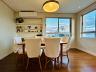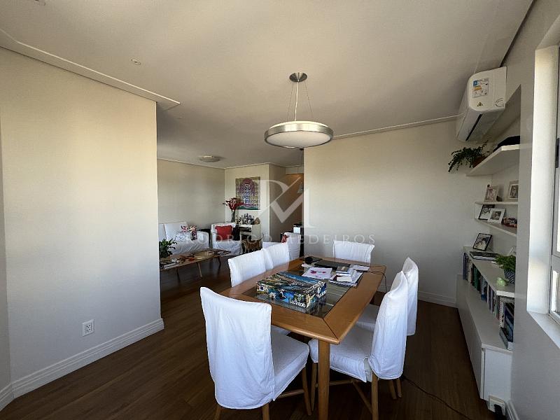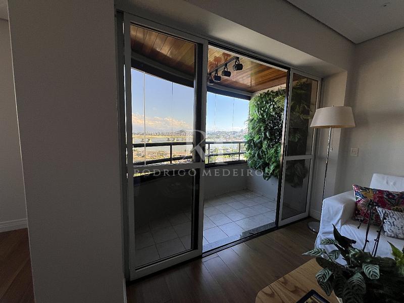 A área social é composta por sala de estar e jantar integradas, com acesso à sacada que proporciona vista livre para a Ponte Hercílio Luz — um dos cartões-postais mais emblemáticos de Florianópolis. O ambiente recebe excelente iluminação natural e favorece momentos de convivência com conforto.