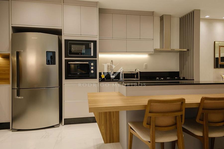 São três suítes confortáveis, garantindo privacidade e funcionalidade no dia a dia. O apartamento está mobiliado e climatizado, pronto para morar, com ambientes que oferecem praticidade e elegância desde o primeiro contato. A cozinha é independente, com ótima circulação, conectada à área de serviço de forma discreta e funcional.