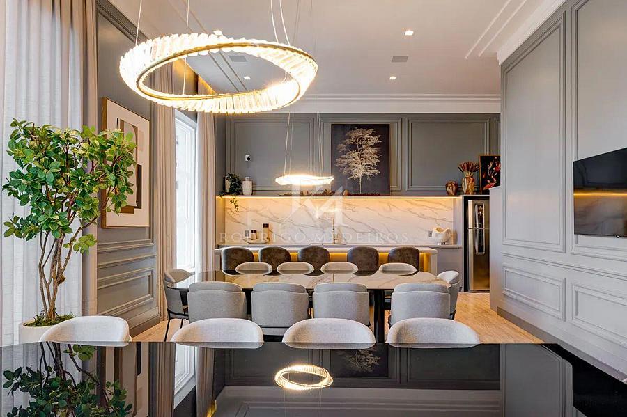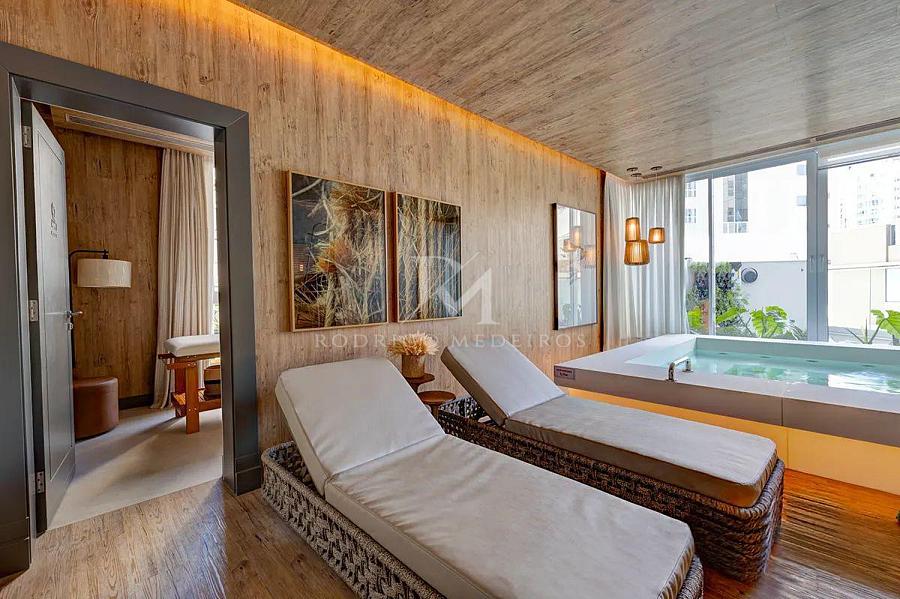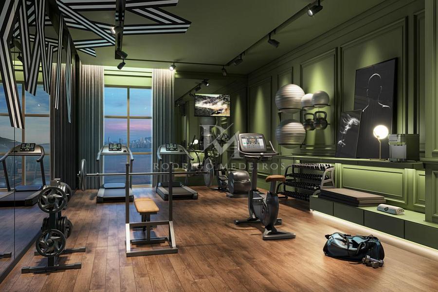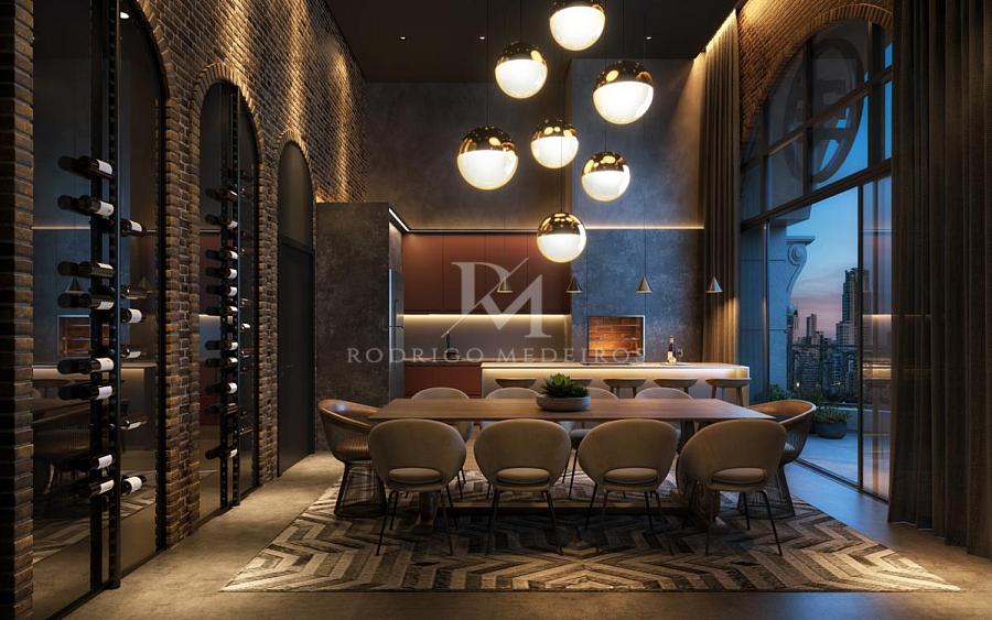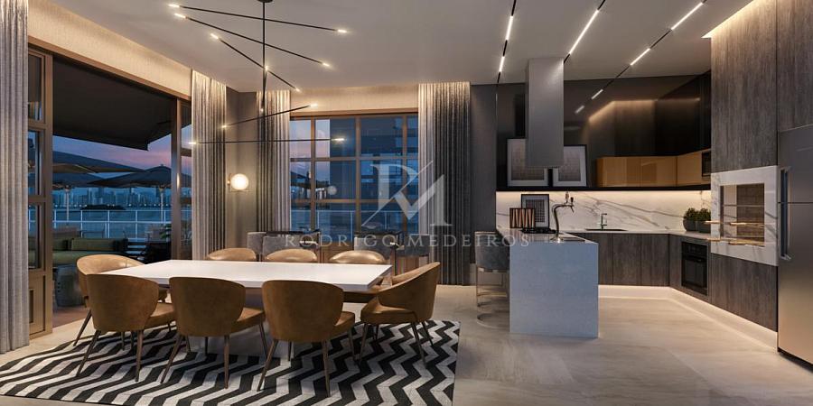 Com 45 pavimentos e apenas um apartamento por andar, o empreendimento apresenta unidades espaçosas com 160,76m² de área privativa, três suítes e três vagas de garagem. Os ambientes incluem sala de estar e jantar, cozinha gourmet, sacada com churrasqueira a carvão, área de serviço e banheiro social.