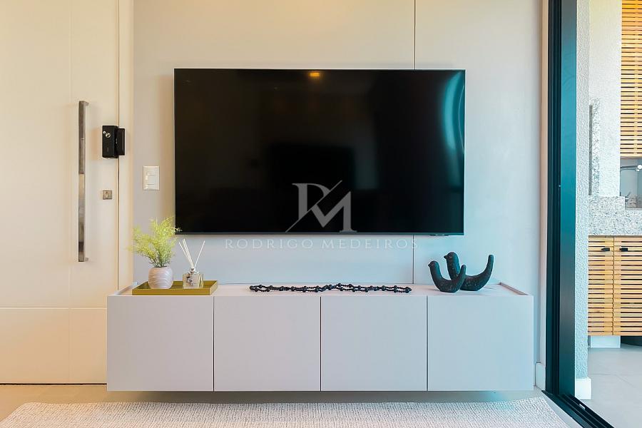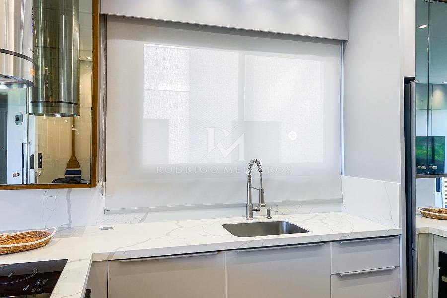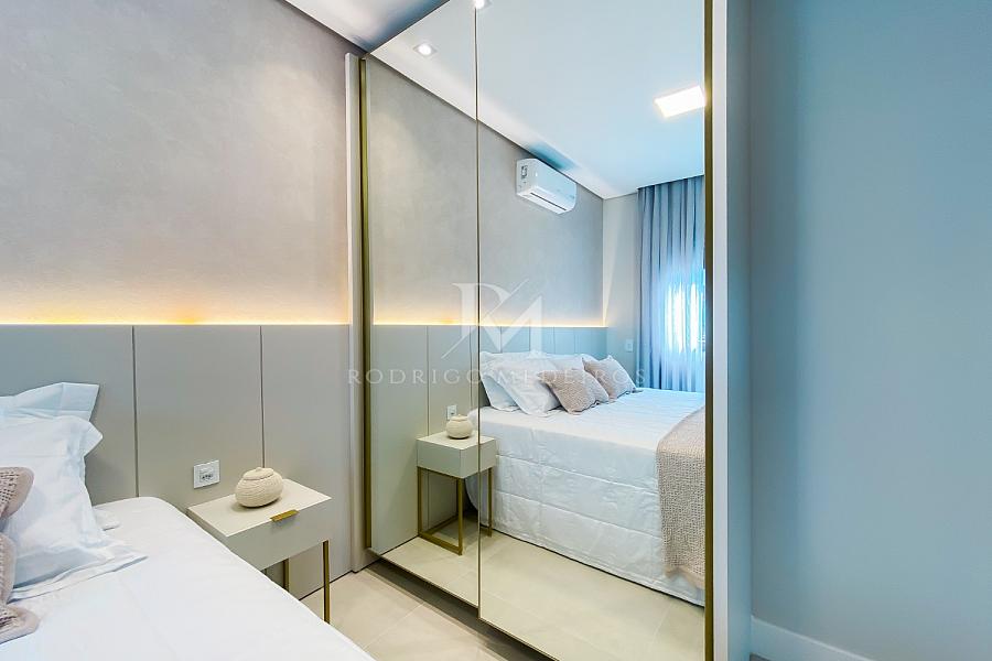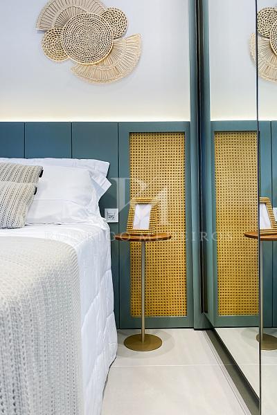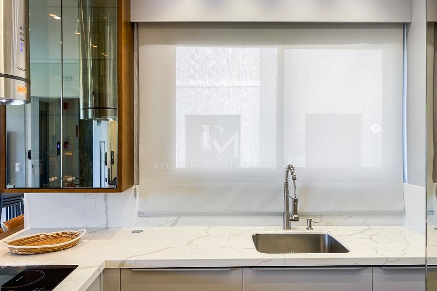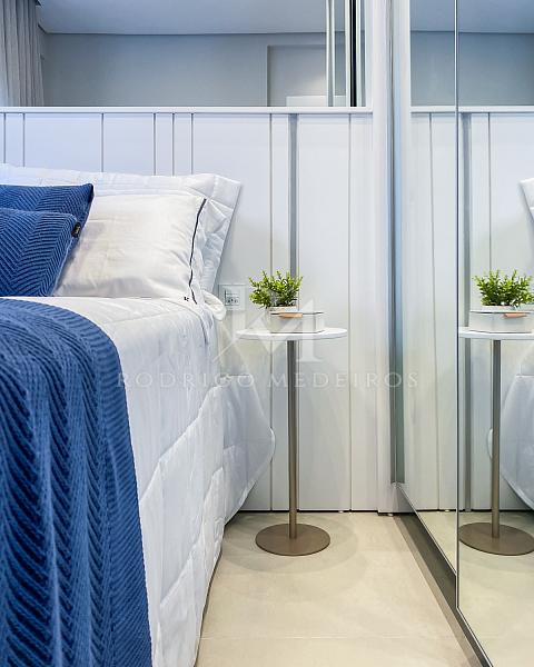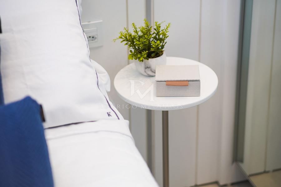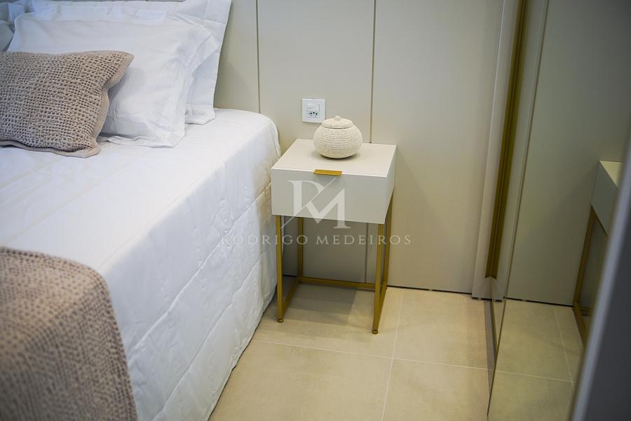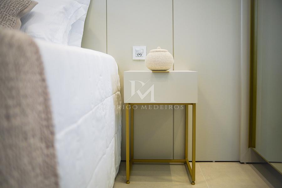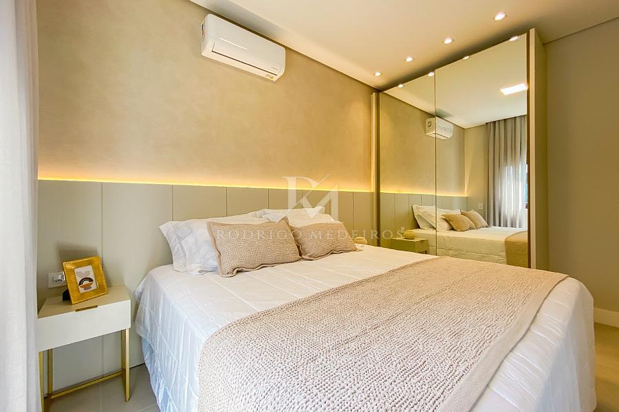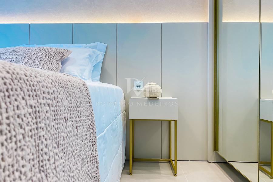 Os acabamentos reforçam a proposta de alto padrão: teto rebaixado em gesso, persianas eletrônicas integradas nos dormitórios, climatização por ar-condicionado tipo split em todos os ambientes, revestimento em porcelanato retificado e marcenaria com portas e rodapés laqueados. A infraestrutura inclui ainda hidrômetro individual, garantindo mais autonomia e controle no dia a dia.