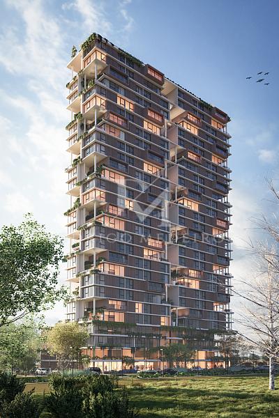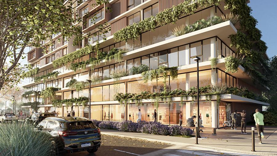 A fachada impressiona pela biofilia, volumes em cubos, pilares arredondados e brises em alumínio, enquanto o hall social ostenta um pé-direito imponente de 12 metros. São 30 pavimentos, sendo 24 residenciais, com três elevadores, três acessos de garagem e duas vagas por apartamento.