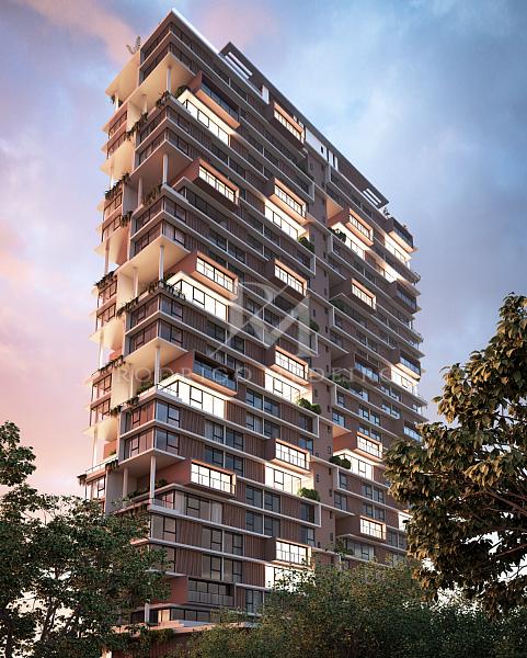 A fachada impressiona pela biofilia, volumes em cubos, pilares arredondados e brises em alumínio, enquanto o hall social ostenta um pé-direito imponente de 12 metros. São 30 pavimentos, sendo 24 residenciais, com três elevadores, três acessos de garagem e duas vagas por apartamento.
