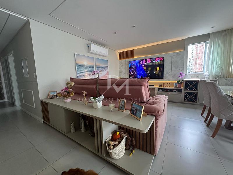 Com 136m² de área privativa e 198,15m² de área total, o apartamento 501 está finamente mobiliado, com ambientes planejados para oferecer praticidade no dia a dia e elegância na recepção de convidados. A sala integra-se à cozinha sob medida, criando um espaço fluido e acolhedor, enquanto a sacada ampla com churrasqueira amplia a área social e favorece momentos de convivência.