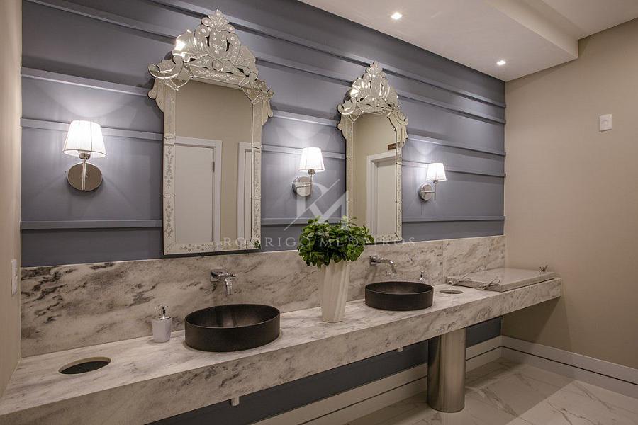 A fachada neoclássica se impõe com elegância, enriquecida por detalhes em pele de vidro. Ao entrar no hall social com pé-direito duplo, o cenário encanta: pendente de cristal refletido no porcelanato marmorado, painéis de madeira e texturas em 3D se combinam em um ambiente que já revela a essência do projeto — refinamento, história e impacto visual.