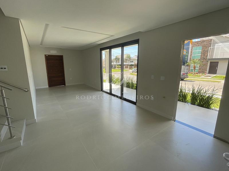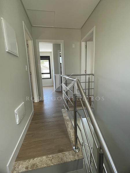 Distribuída em dois pavimentos, a casa conta com 162,12 m² de área construída sobre um terreno privativo de 247,42 m². No térreo, os ambientes integram sala de estar, jantar e cozinha, além de lavabo, varanda com churrasqueira e uma garagem coberta para dois veículos. No andar superior, três suítes proporcionam privacidade e funcionalidade, todas com persianas automatizadas em esquadrias de alumínio na cor preta.