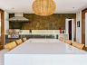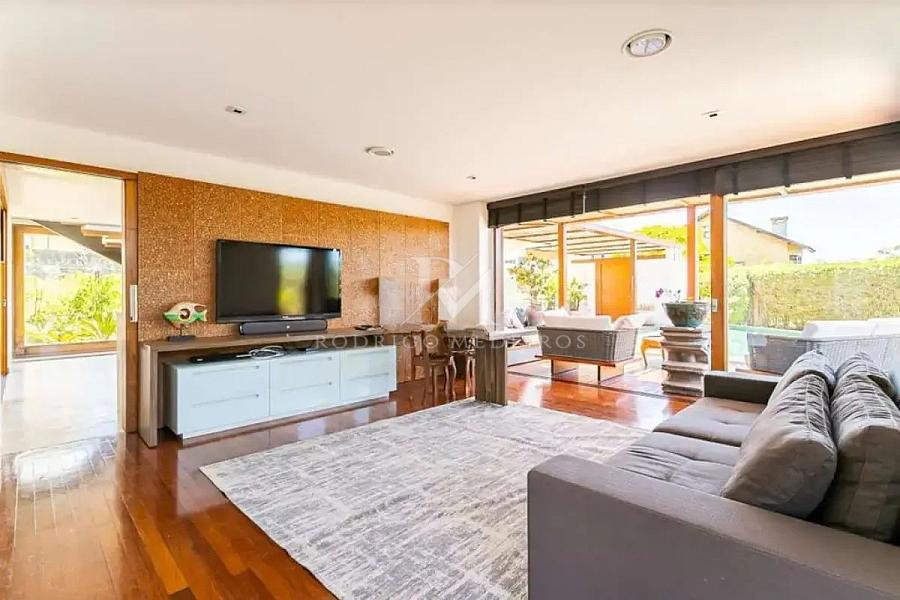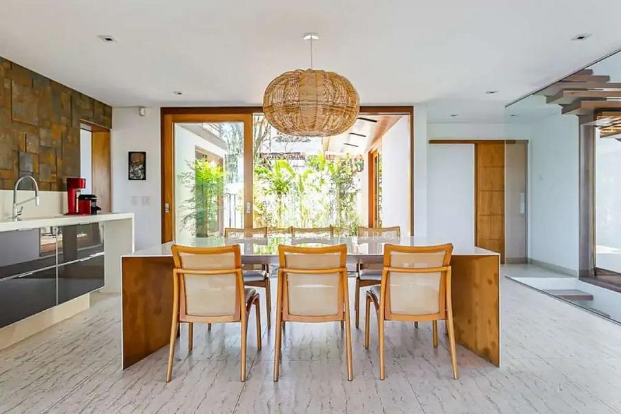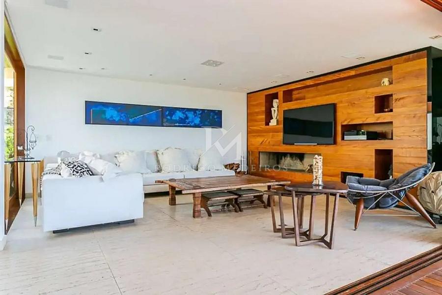 No térreo, a área social impressiona pela integração e pelo nível de acabamento. O living com home theater se conecta ao espaço gourmet, criando um ambiente sofisticado e funcional para receber. A presença de mobiliário assinado e elementos contemporâneos reforça o padrão elevado da residência.