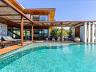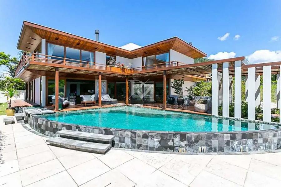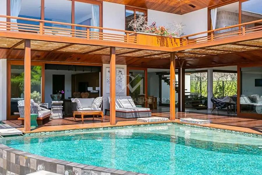A área externa é um dos grandes diferenciais, com deck em madeira nobre envolvendo a piscina de borda infinita, equipada com jacuzzi e sistema de cromoterapia. O conjunto cria um cenário único, totalmente integrado à paisagem natural.