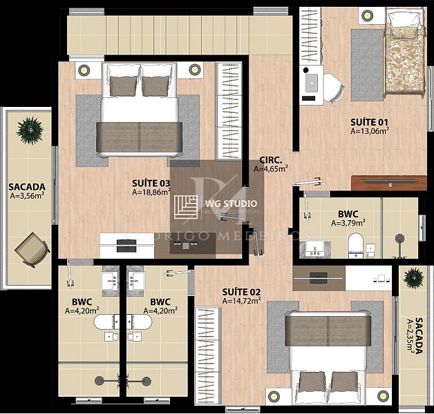 No pavimento térreo, os ambientes sociais ganham leveza e integração com sala e cozinha em conceito aberto, além de lavabo, área de serviço e um depósito funcional. O jardim com gramado privativo adiciona um toque de charme e oferece a possibilidade de futuras ampliações – o imóvel já conta com estrutura preparada para instalação de piscina, com ponto de luz e sistema de drenagem.