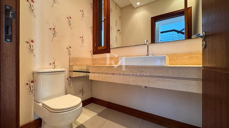 São três suítes bem distribuídas, além de um estúdio no térreo com banheiro completo, ideal para hóspedes, home office ampliado ou uso independente. No total, a casa oferece seis banheiros e quatro vagas de garagem, garantindo funcionalidade para diferentes perfis de moradia.