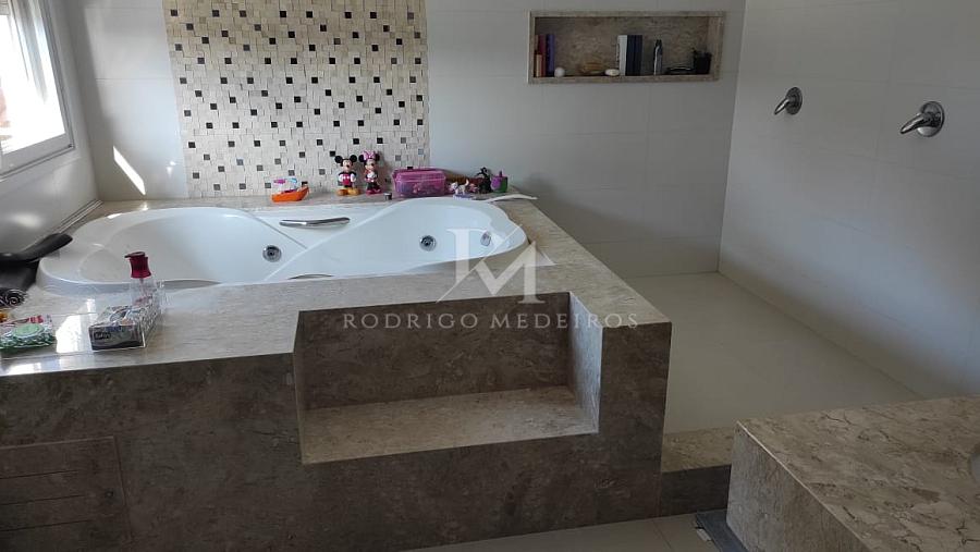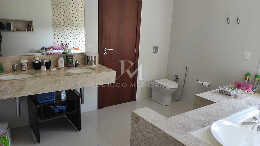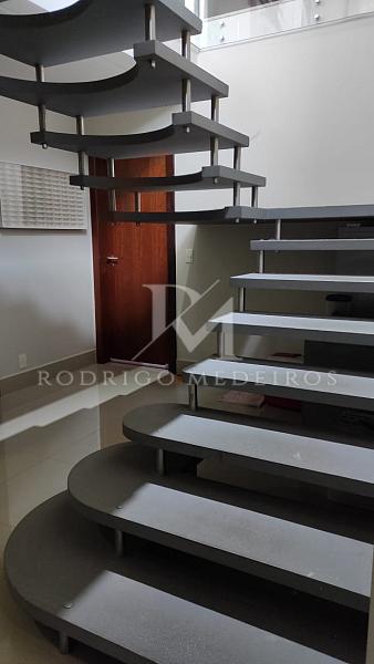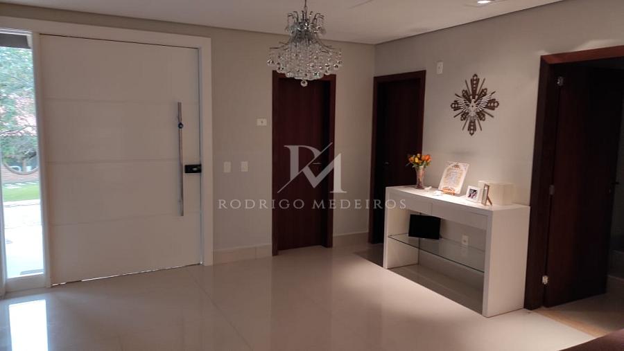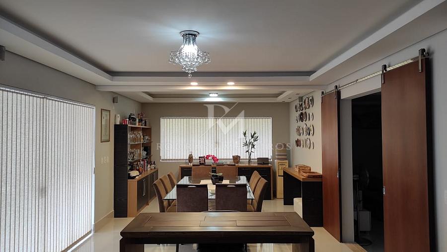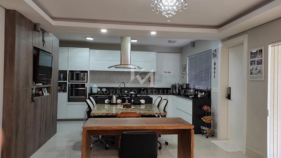 Implantada em um terreno generoso, a residência apresenta uma arquitetura que valoriza os espaços amplos e bem distribuídos, com ambientes pensados para proporcionar conforto tanto no dia a dia quanto em momentos de convivência. A área social contempla sala de estar, sala de jantar e um acolhedor home theater, criando diferentes possibilidades de uso com fluidez e integração.