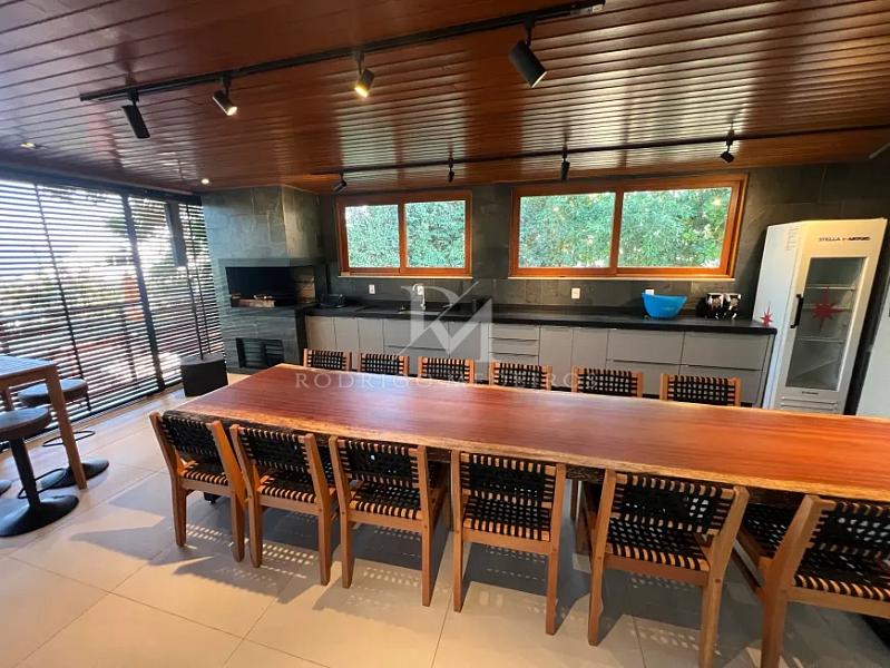 Logo na entrada, a arquitetura surpreende com pé-direito alto, mezanino e uma atmosfera arejada que valoriza a integração entre os espaços. A área social oferece sala de jantar, sala grande com lareira, sala de almoço e até uma sala pequena, ideal para momentos mais íntimos ou relaxantes.