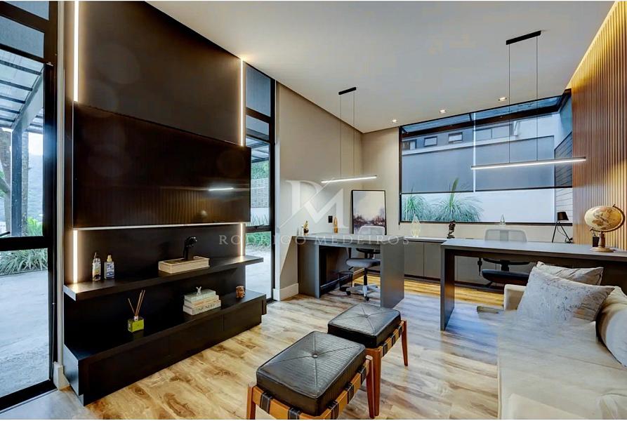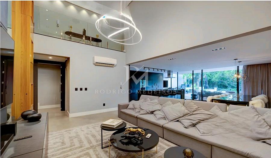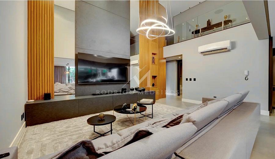 No térreo, os ambientes sociais se conectam em um living integrado que reúne sala de estar, sala de jantar e cozinha com ilha central, criando um cenário perfeito para o convívio. O espaço ainda conta com um escritório versátil, lavabo e uma ampla lavanderia, além de área técnica funcional.