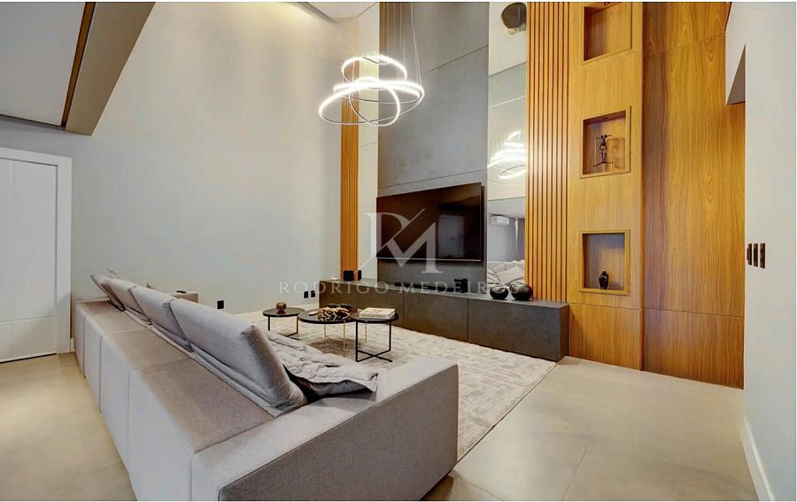 Com 317m² construídos em um lote de 450m², o imóvel distribui seus espaços em dois andares. No pavimento superior, encontram-se 4 suítes, incluindo uma suíte master com amplo closet e banheira, pensada para oferecer momentos de relaxamento e privacidade.