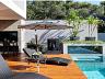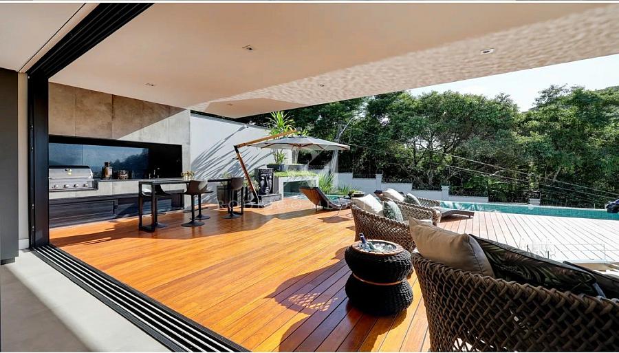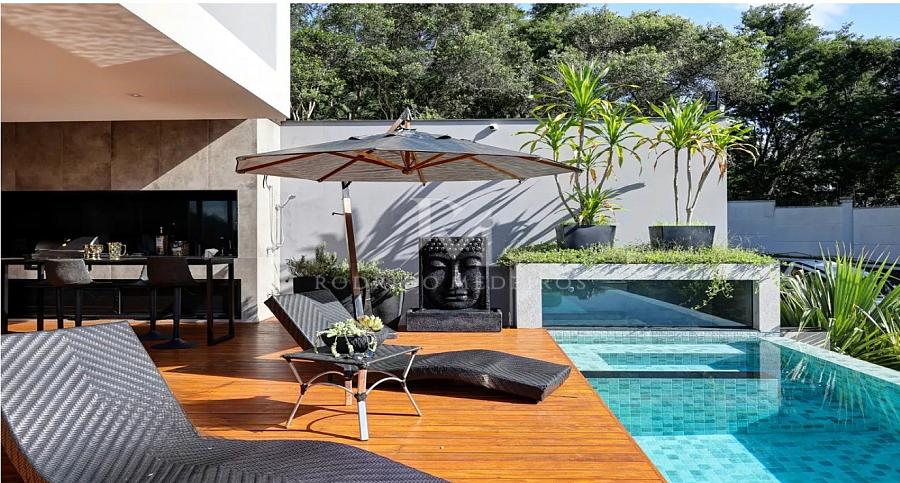 A área externa foi projetada para o lazer completo. Uma piscina com aquecimento por bomba de calor se une à sauna e ao espaço gourmet, equipado com churrasqueira a carvão, churrasqueira americana e cervejeira. Tudo isso em perfeita harmonia com o living interno, criando um ambiente fluido entre interior e exterior.