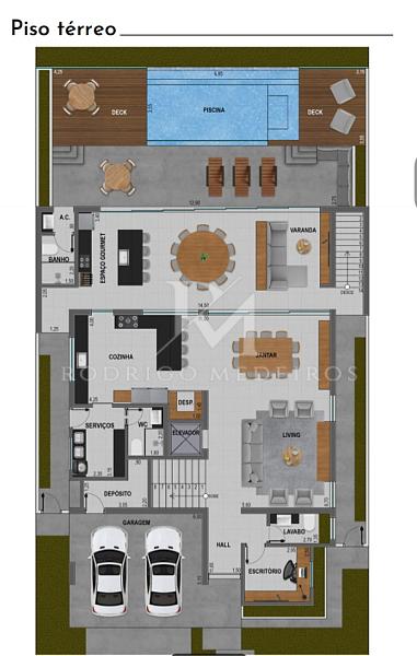 Com 493,76 m² de área construída em um terreno de 450 m², esta residência foi planejada para oferecer funcionalidade e amplitude em todos os ambientes. No pavimento térreo, a área social integra sala de estar, jantar e TV em um layout fluido, voltado para o lazer e para os momentos em família. Grandes aberturas conectam esses ambientes à varanda gourmet e à piscina, criando um espaço ideal para receber com elegância.