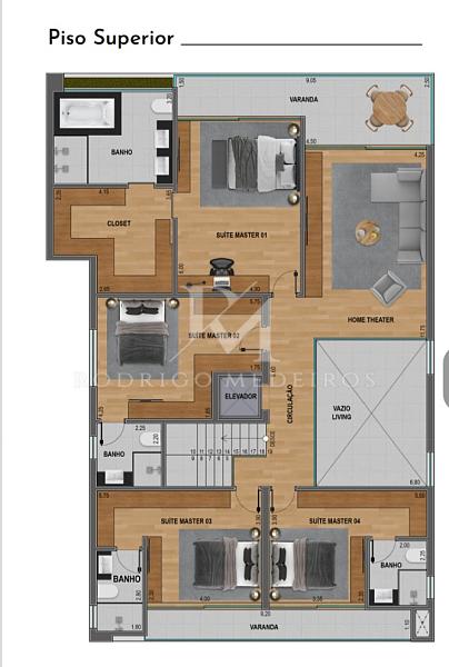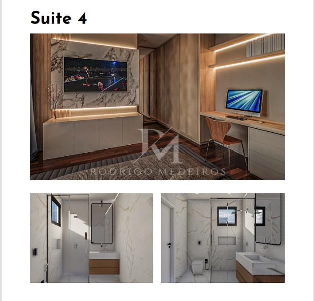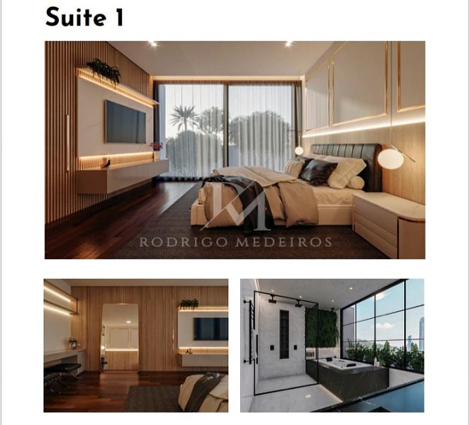 No pavimento superior, a área íntima conta com 4 suítes bem distribuídas, projetadas para conforto absoluto e privacidade. O ambiente também contempla uma varanda com 28,92 m² e vista para o entorno arborizado do condomínio.