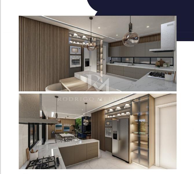 A cozinha ampla, com bancadas generosas e espaço inteligente para armazenamento, dialoga com a área gourmet, perfeita para confraternizações. Um escritório funcional e lavabo complementam o pavimento, além da lavanderia separada e um depósito no pavimento inferior.