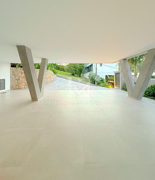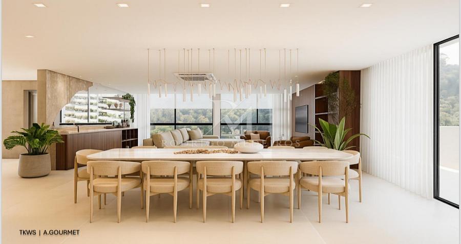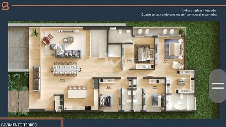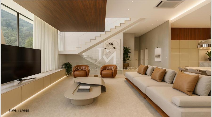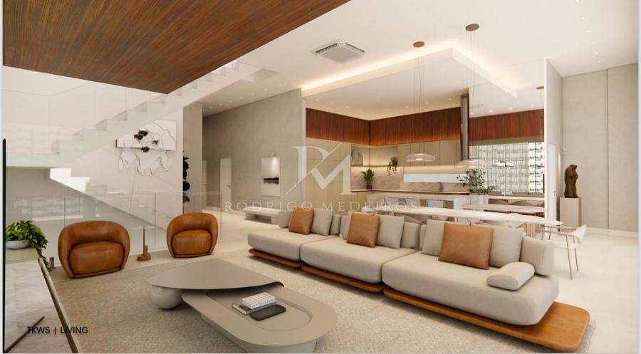 São 4 suítes distribuídas de forma inteligente, incluindo uma suíte master imponente, com sala de banho e elementos arquitetônicos que privilegiam iluminação natural. O living principal, marcado pelo pé-direito duplo, se conecta de maneira fluida com a sala de jantar, a cozinha gourmet e as áreas externas, criando espaços que unem elegância e funcionalidade.