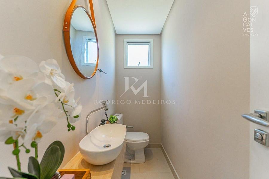 A residência dispõe de 5 banheiros, lavabo e 4 vagas de garagem, sendo 2 cobertas, garantindo funcionalidade no dia a dia.