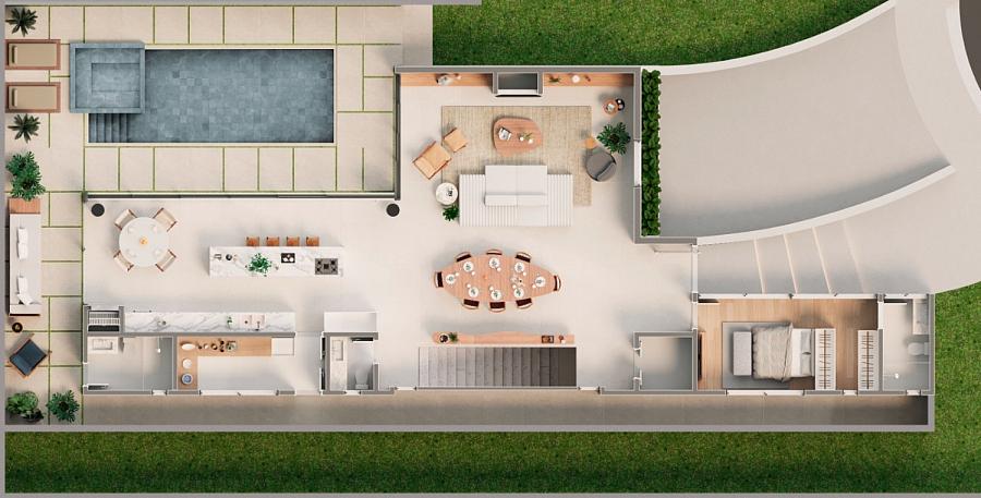 • Cozinha, sala de jantar e living com ambientes integrados, promovendo fluidez e elegância