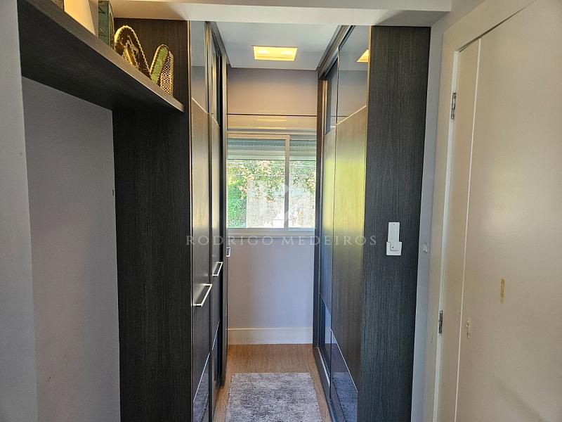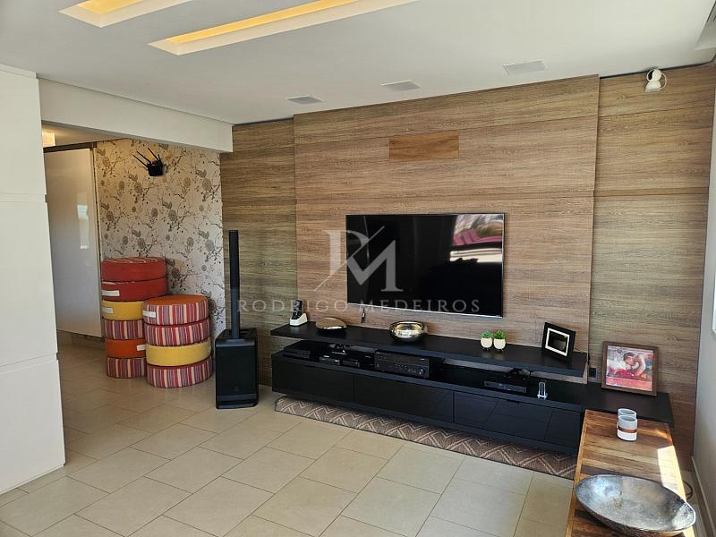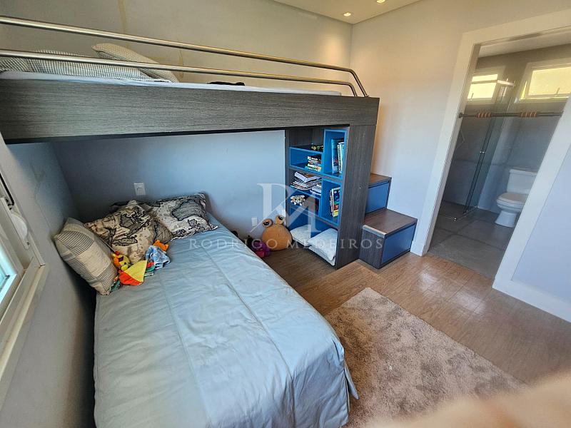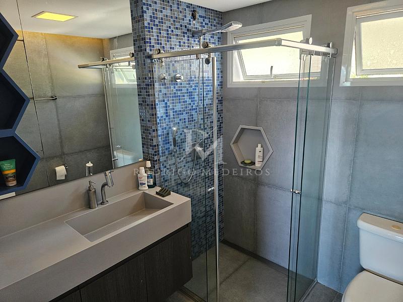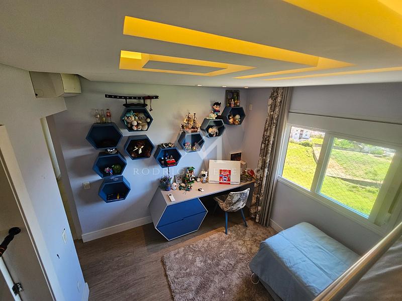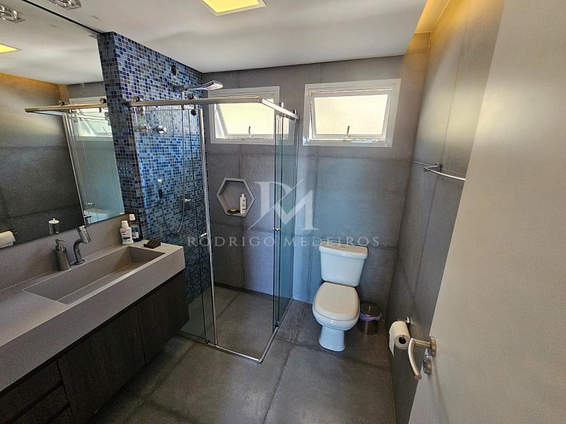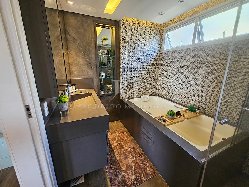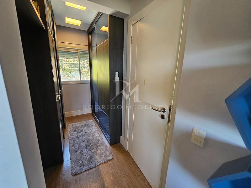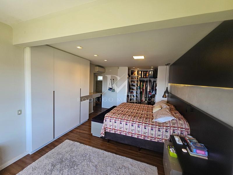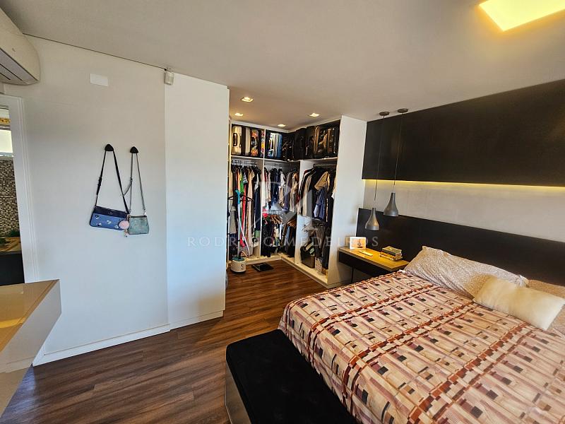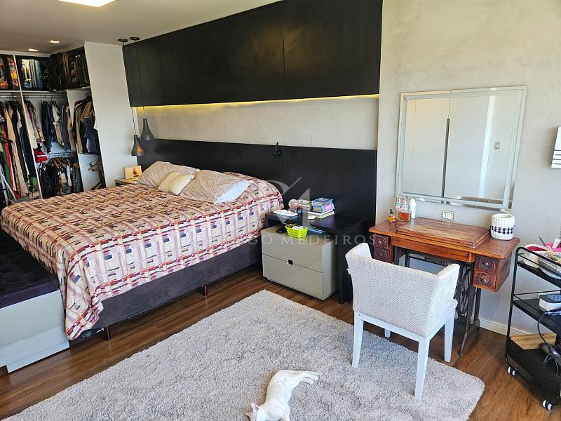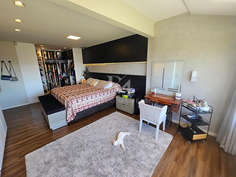 No pavimento superior estão as três suítes, todas amplas, climatizadas e com móveis embutidos de alto padrão. A suíte master conta com closet e banheiro com pia em corian, reforçando o cuidado nos acabamentos. A reforma recente de banheiros e dormitórios atualiza o imóvel e eleva ainda mais seu padrão.
