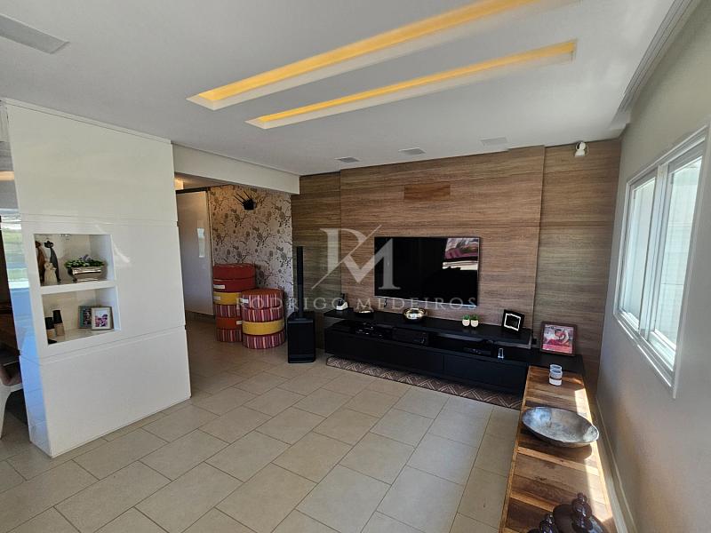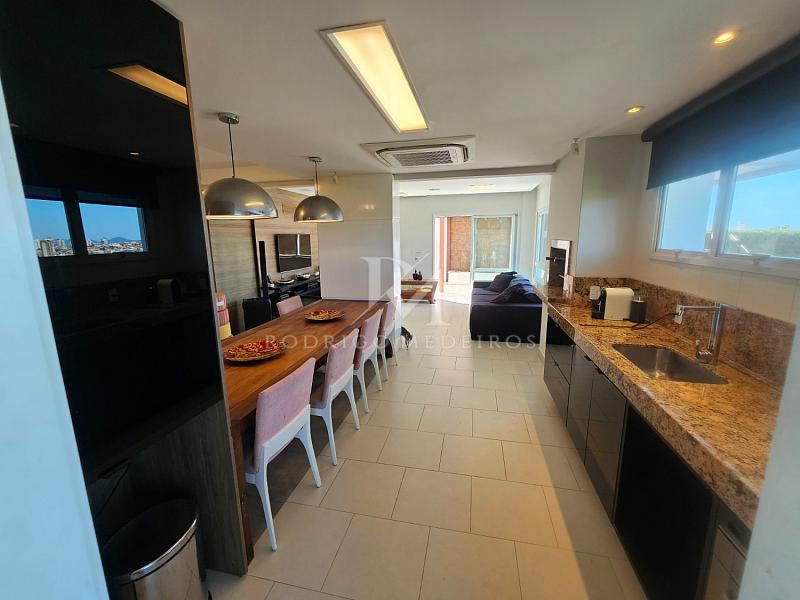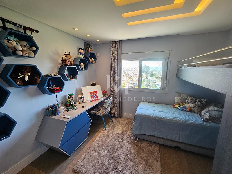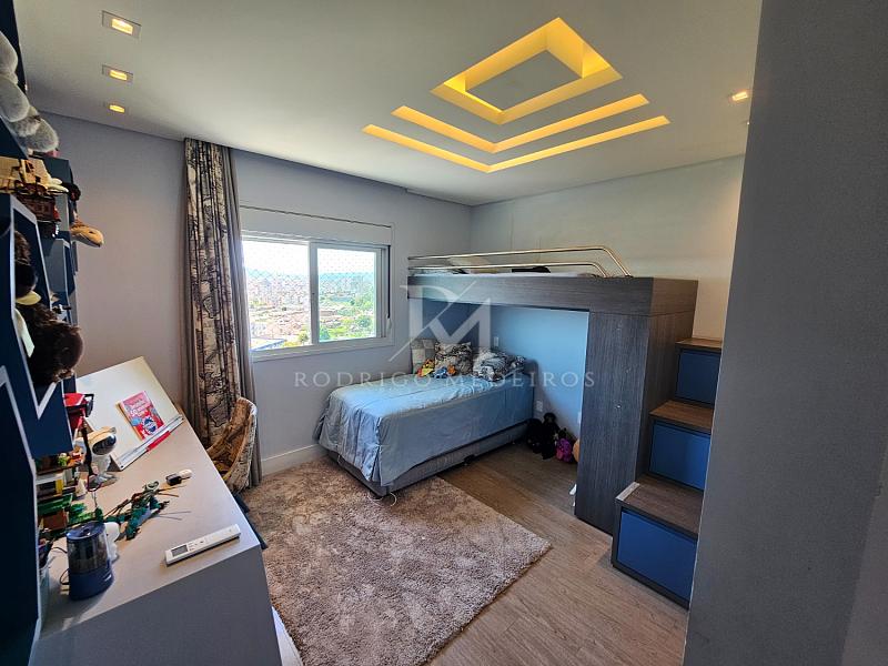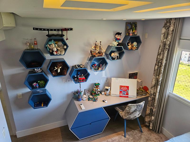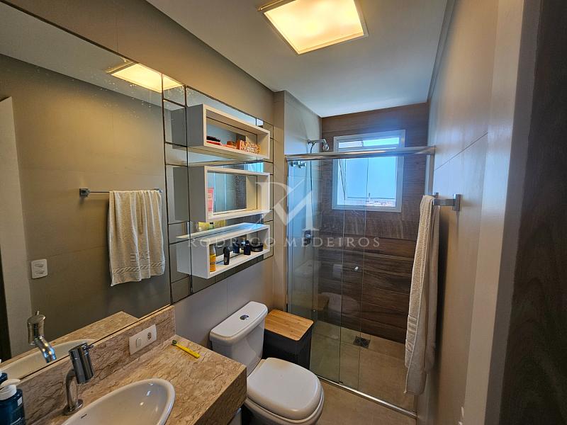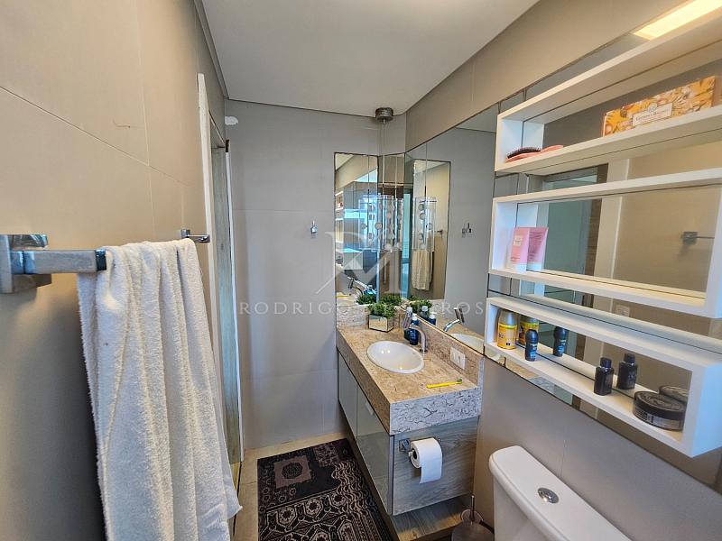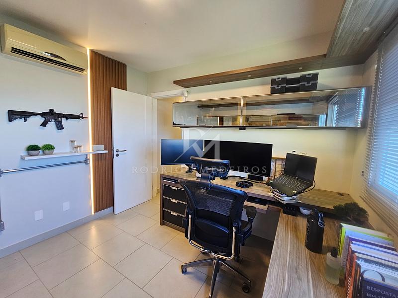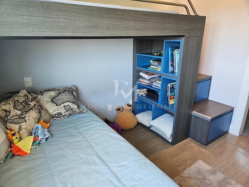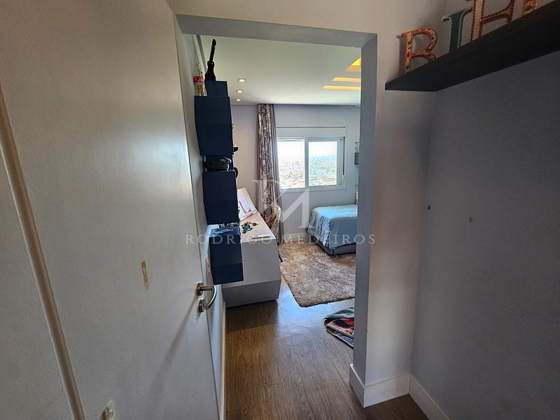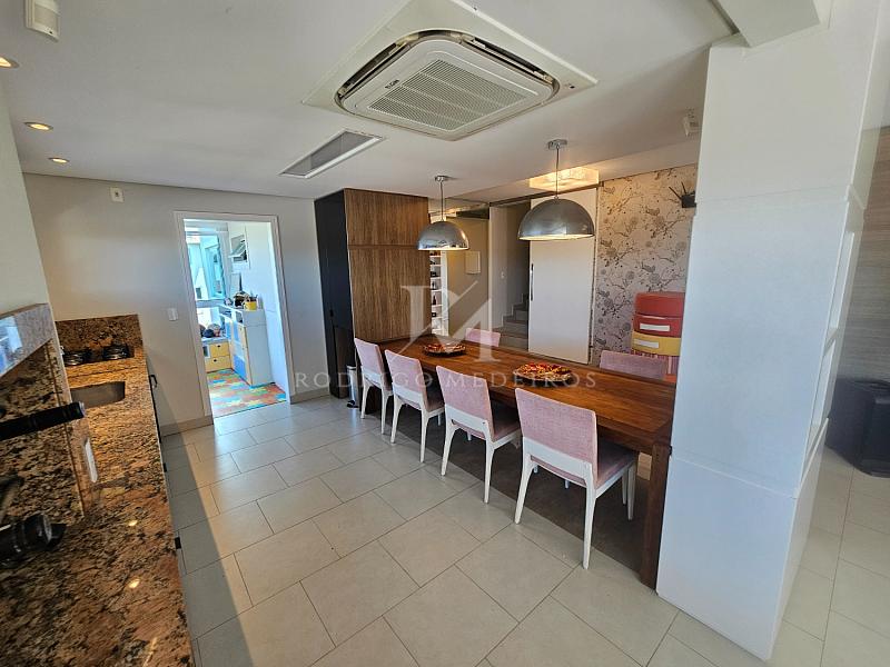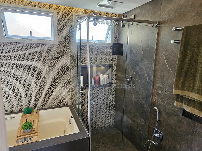 No pavimento superior estão as três suítes, todas amplas, climatizadas e com móveis embutidos de alto padrão. A suíte master conta com closet e banheiro com pia em corian, reforçando o cuidado nos acabamentos. A reforma recente de banheiros e dormitórios atualiza o imóvel e eleva ainda mais seu padrão.