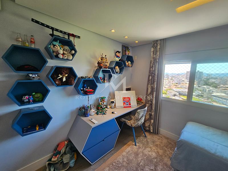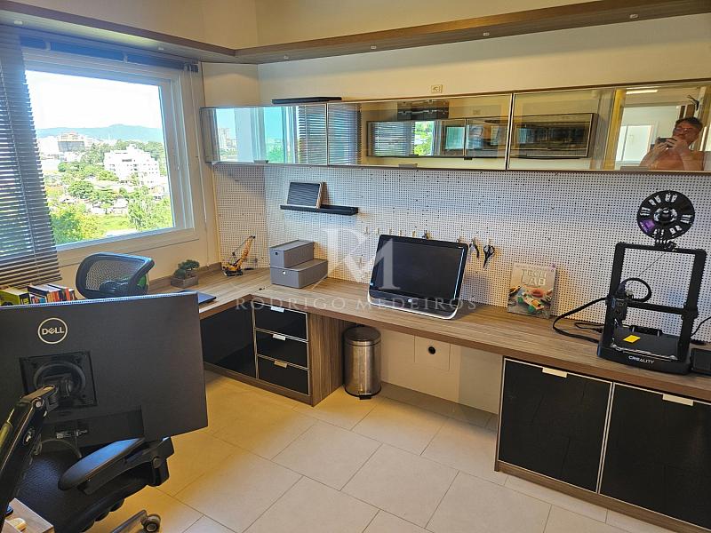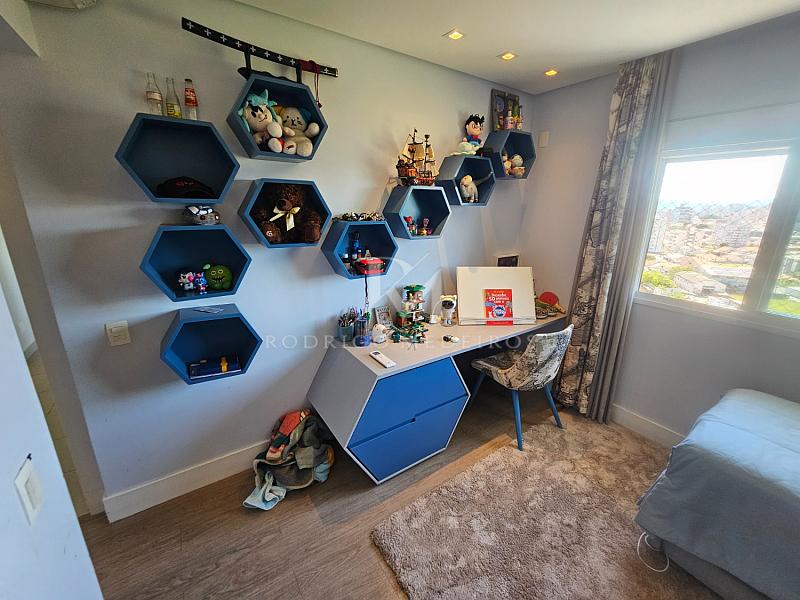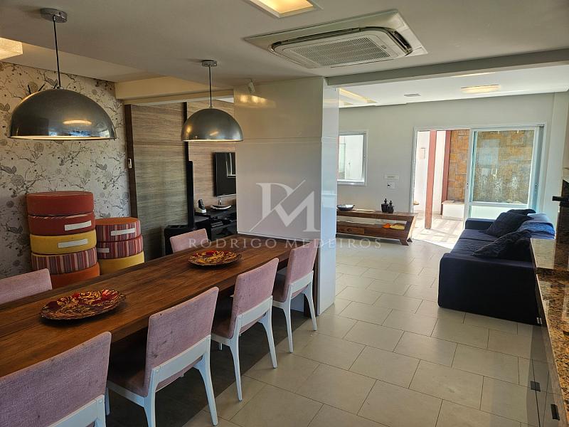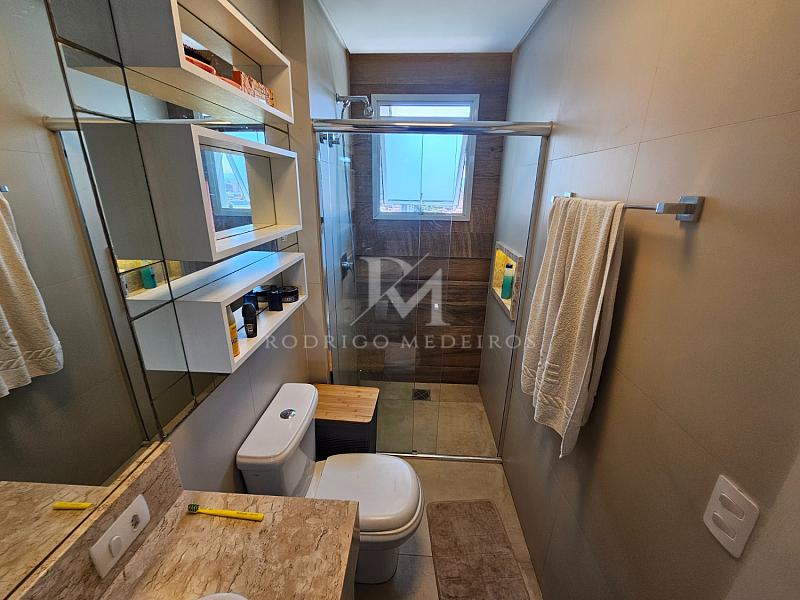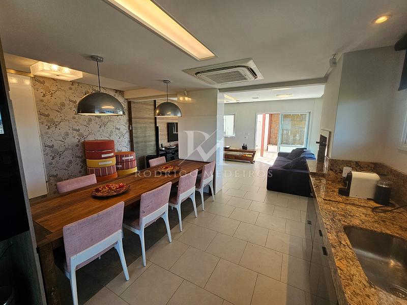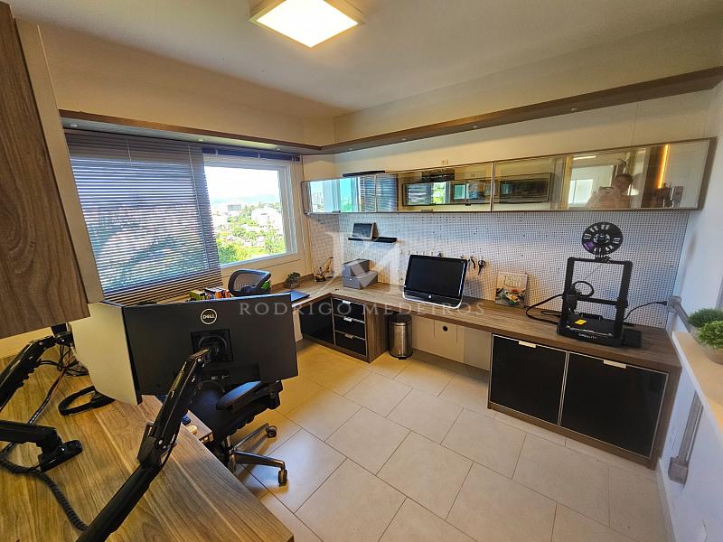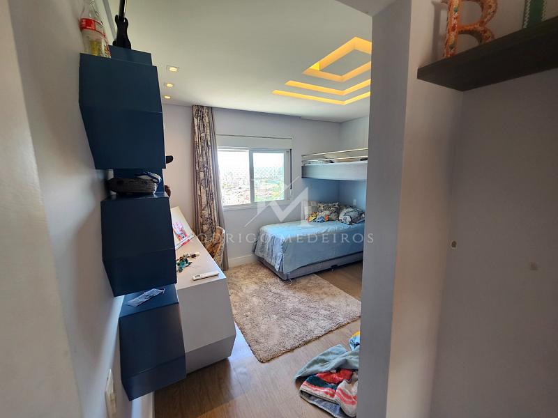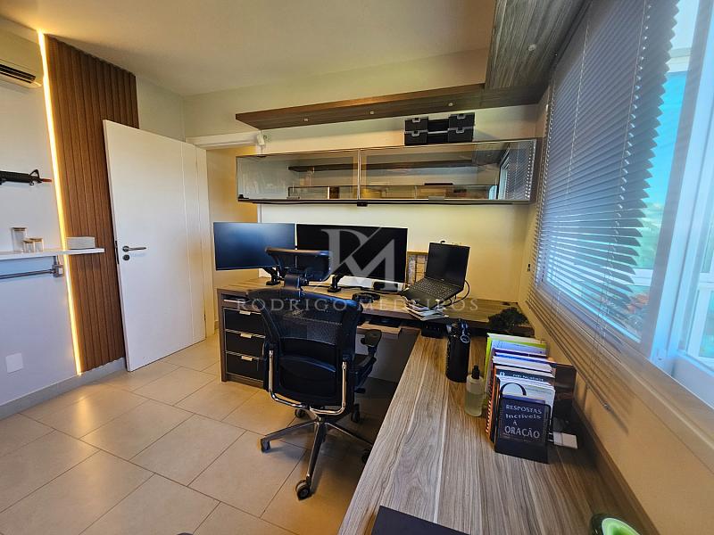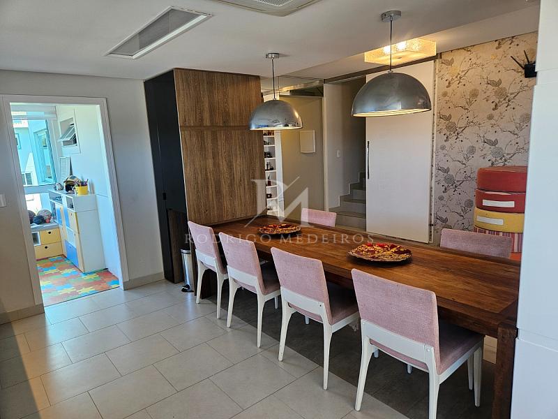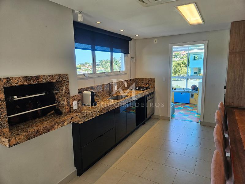 No pavimento superior estão as três suítes, todas amplas, climatizadas e com móveis embutidos de alto padrão. A suíte master conta com closet e banheiro com pia em corian, reforçando o cuidado nos acabamentos. A reforma recente de banheiros e dormitórios atualiza o imóvel e eleva ainda mais seu padrão.