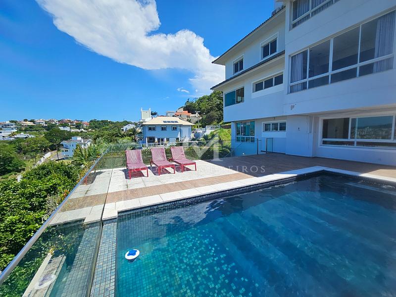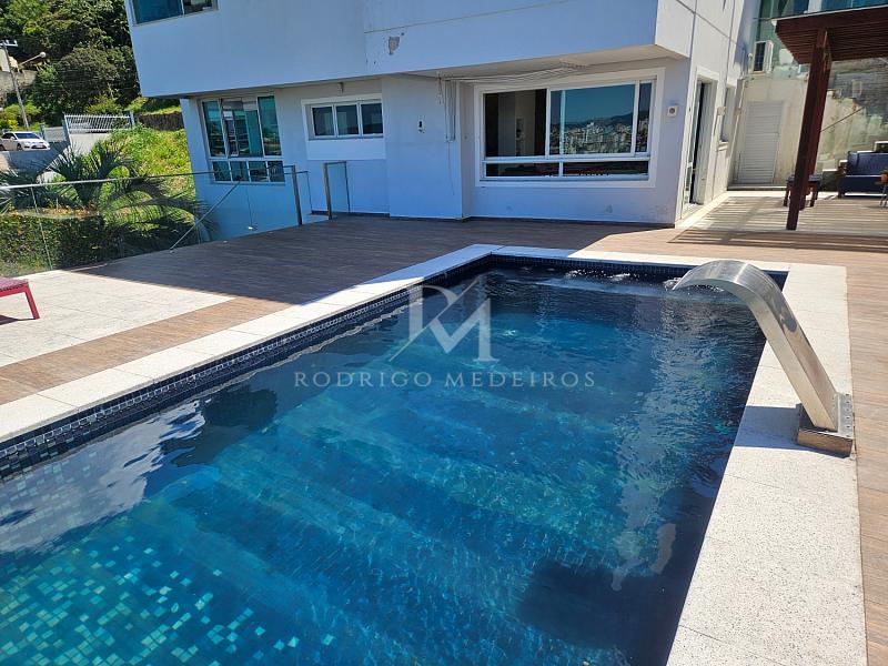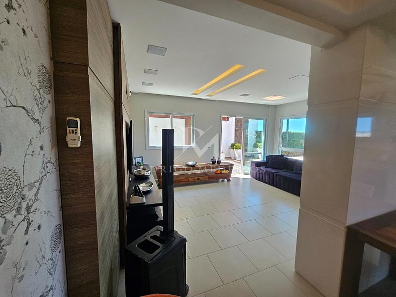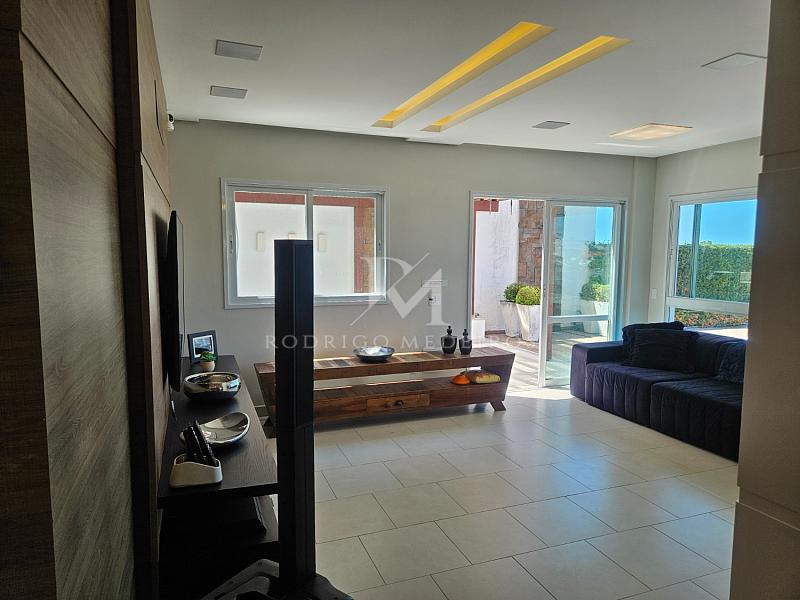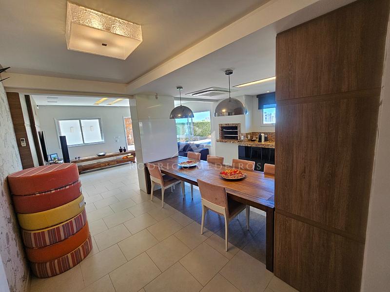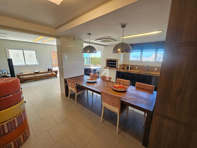 No nível inferior, a casa revela seu perfil voltado ao lazer e convivência. O salão de festas integrado à churrasqueira a carvão e à área gourmet cria um ambiente completo para receber. O espaço se conecta ao deck e à piscina com cascata, jatos de hidromassagem e borda infinita, ampliando a sensação de exclusividade. Há ainda banheiro de apoio, home office, pergolado e amplo espaço externo para mesas e cadeiras.