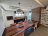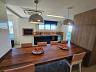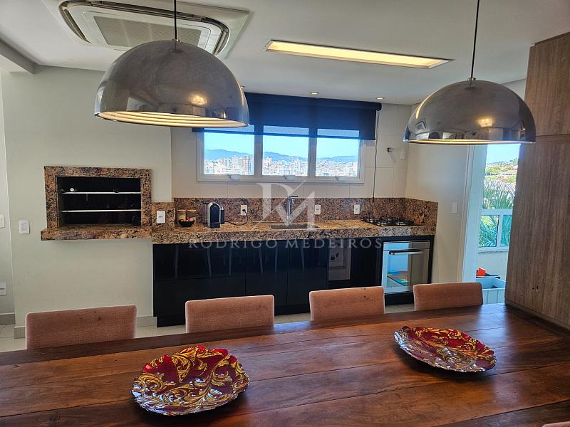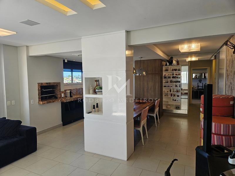 O térreo concentra os ambientes sociais principais: sala de estar, duas salas de jantar, cozinha planejada da marca BonTempo com bancada em corian branco, lavabo, lavanderia e garagens — sendo quatro vagas no total (duas cobertas e duas descobertas), além de box na garagem e infraestrutura para wallbox de carregamento de veículo elétrico.