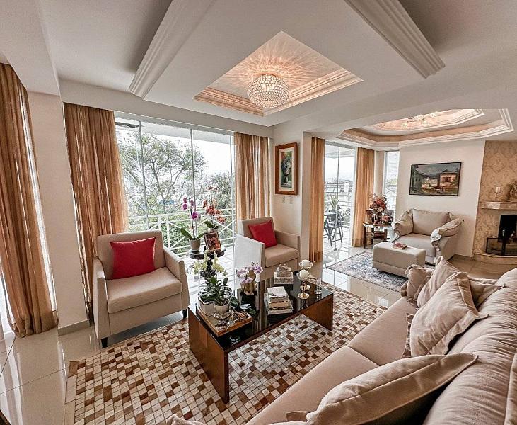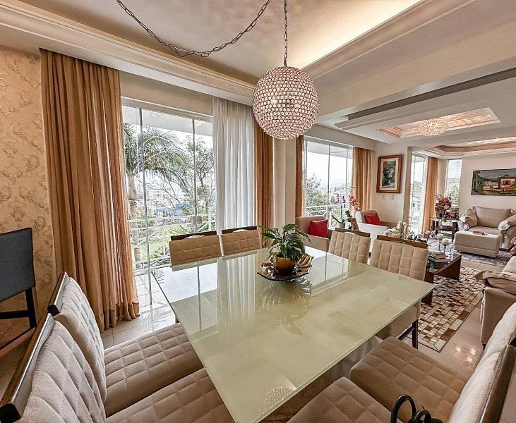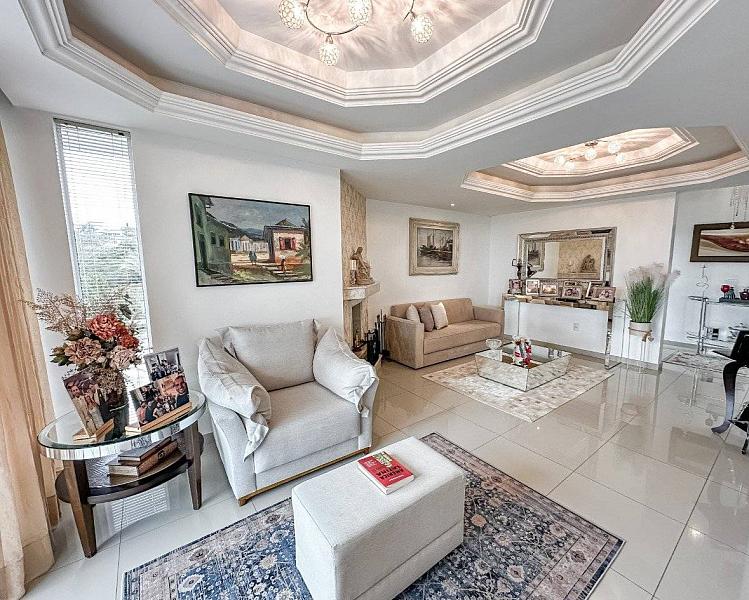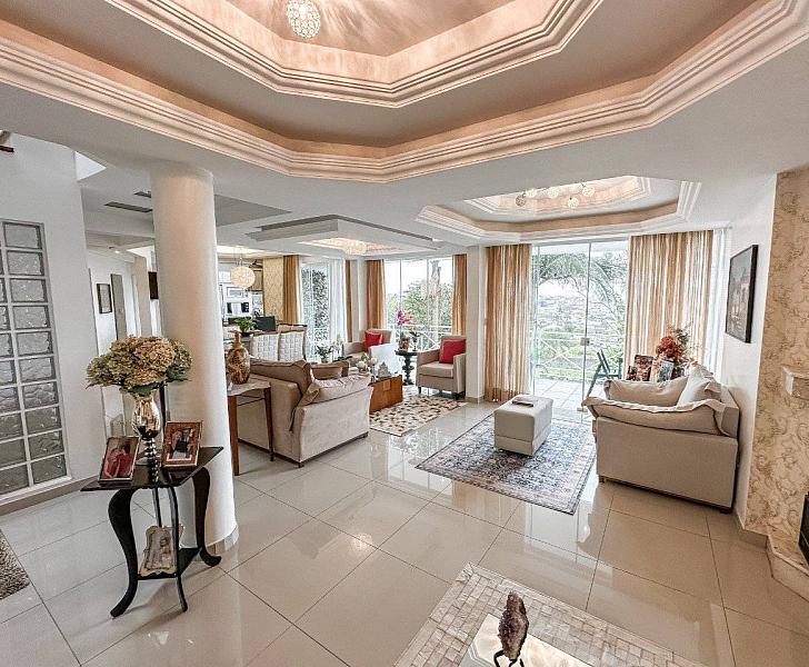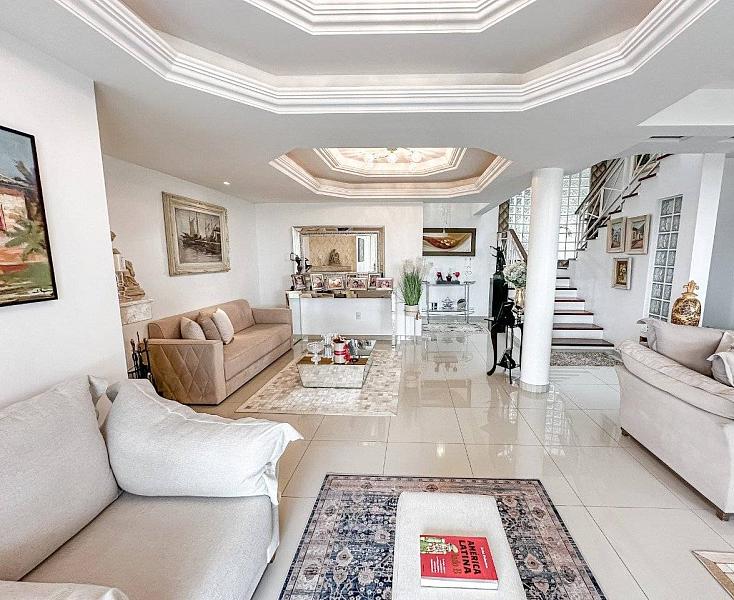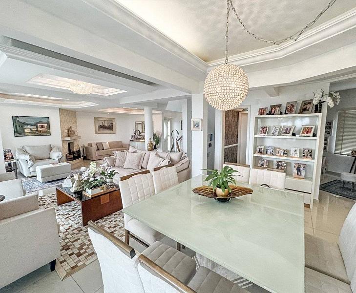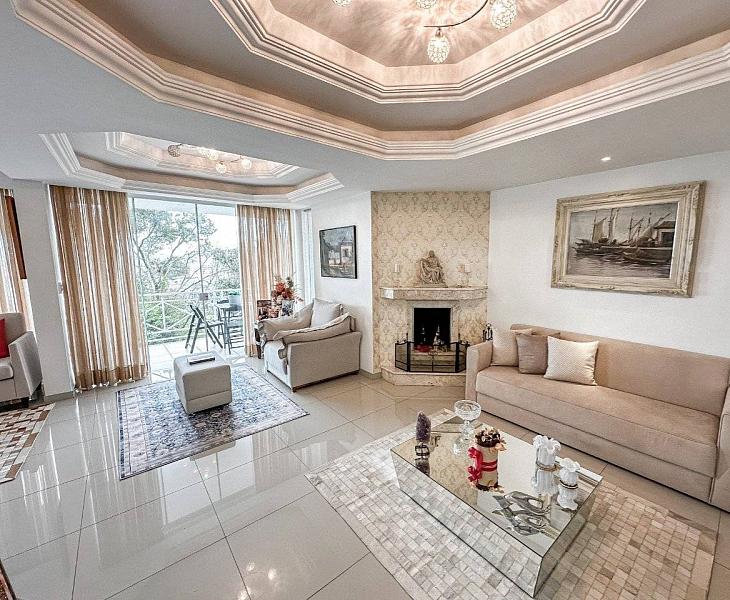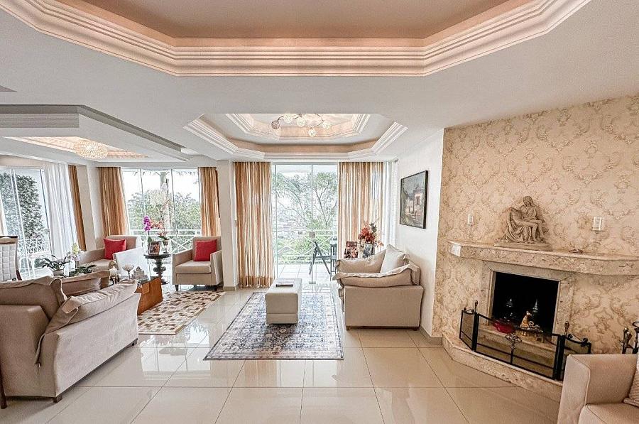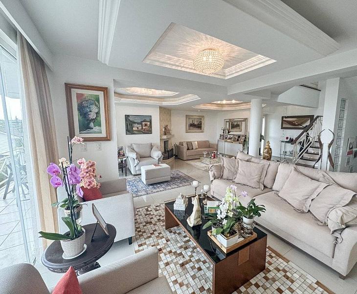 Os acabamentos de alto padrão valorizam cada ambiente. A residência conta com lareira, lavabo, escritório, salas de estar e jantar, cozinha equipada e um amplo living com vista panorâmica. A climatização por ar-condicionado e o mobiliário de bom gosto completam o cenário com elegância e conforto.