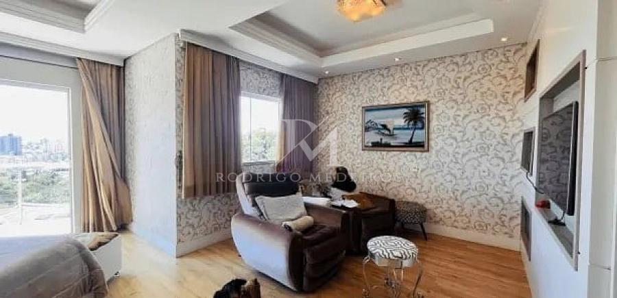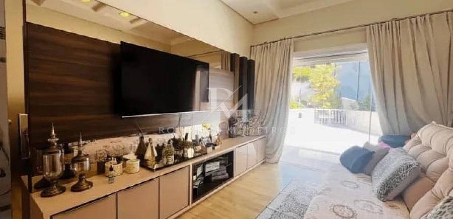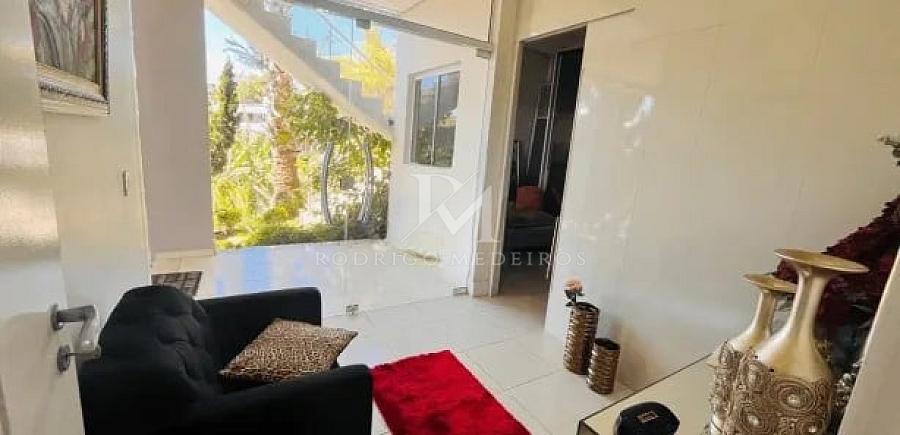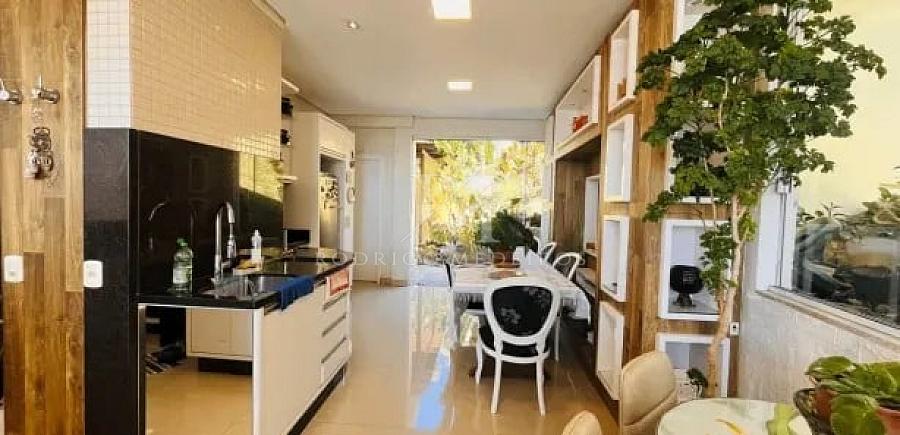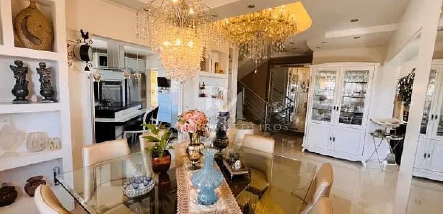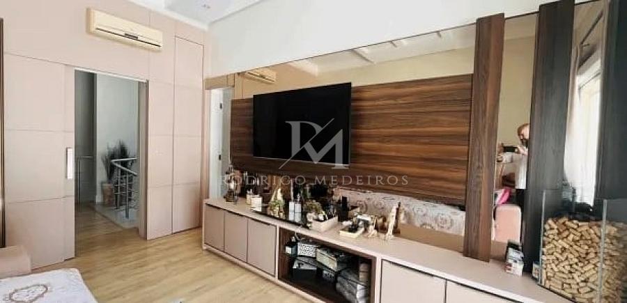 O acesso principal revela ambientes amplos e bem distribuídos, com clara separação entre áreas sociais e íntimas. No segundo pavimento, a área social se destaca pela integração entre sala de estar e jantar, cozinha totalmente mobiliada e espaço gourmet, criando um cenário ideal para receber com elegância. A presença de uma suíte neste nível, atualmente utilizada como sala de TV, oferece flexibilidade de uso conforme a necessidade da família.