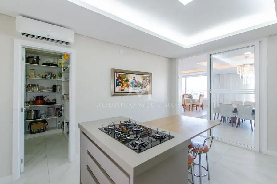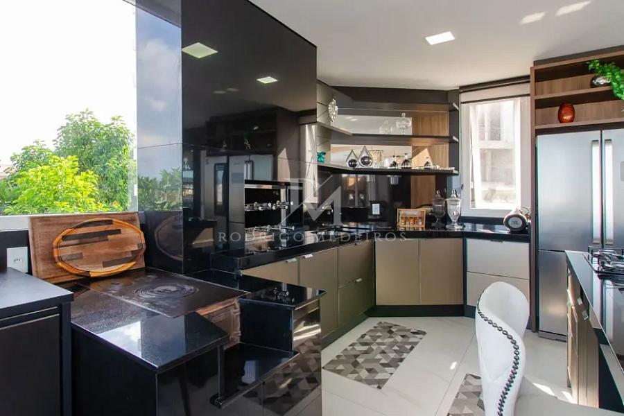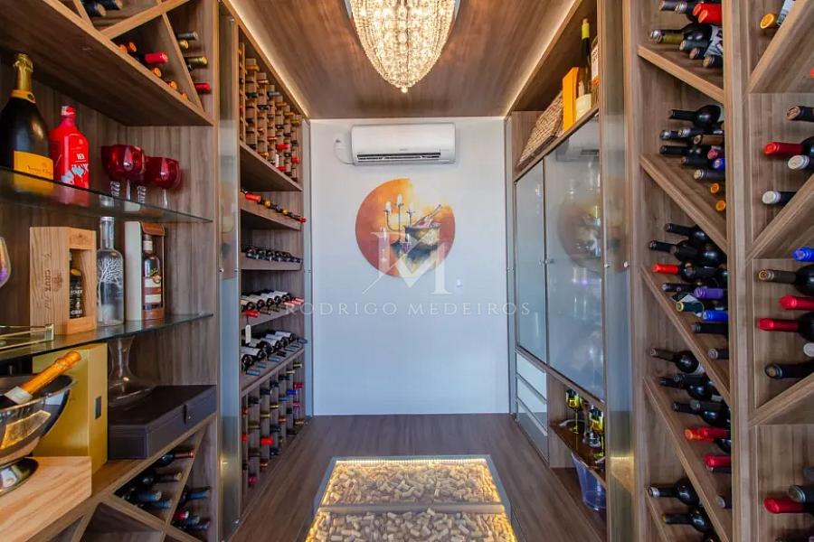A imponente entrada com pé direito duplo e porta pivotante dá o tom da sofisticação logo ao chegar. O pavimento térreo é dedicado às áreas sociais: três amplas salas integradas e climatizadas, espaço gourmet com churrasqueira e forno a lenha, adega climatizada e uma varanda com lareira, ideal para encontros mais intimistas. Há ainda um ambiente versátil que pode funcionar como suíte térrea, home office ou sala de TV, além da cozinha planejada, despensa e lavanderia.