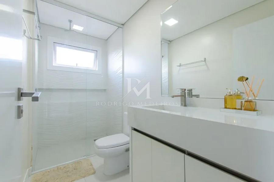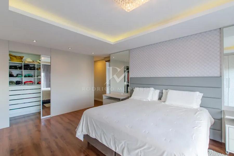 No andar superior, três suítes garantem privacidade e conforto. A suíte master se destaca por seus dois closets e uma banheira de hidromassagem com vista para o mar. Toda a casa foi pensada com infraestrutura para elevador, ampliando o conforto e a acessibilidade.