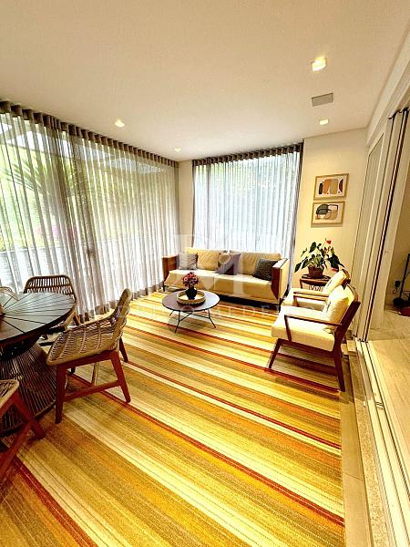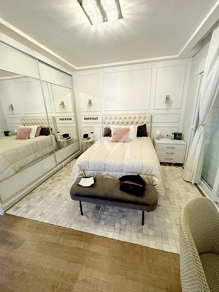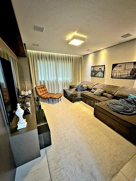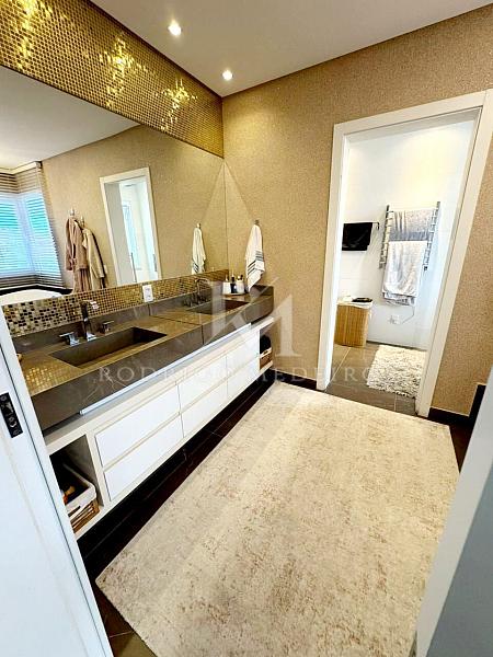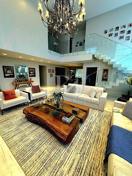 A planta conta com 4 suítes generosas, sendo a suíte master equipada com som ambiente, closet espaçoso e banheiro com hidromassagem, perfeito para momentos de relaxamento. O living com pé-direito duplo e lareira é realçado por paredes em pele de vidro refletivo, valorizando a vista externa e a luminosidade natural.