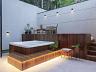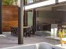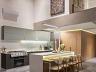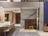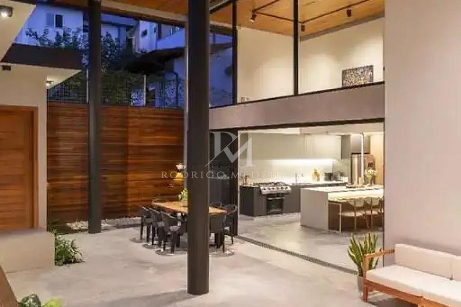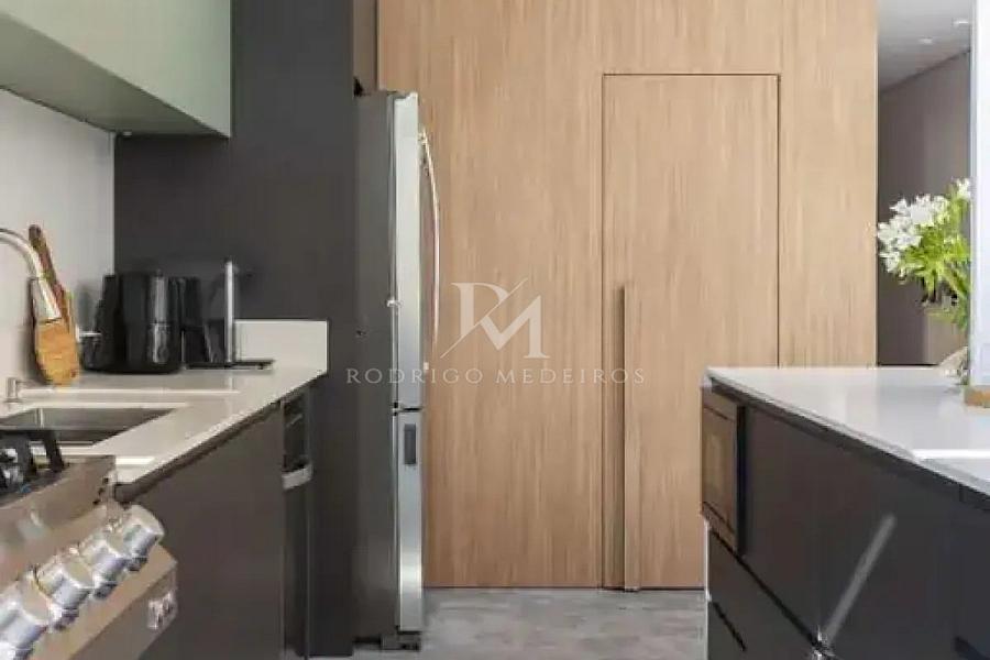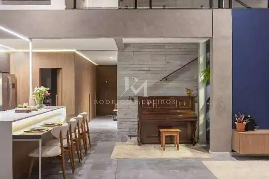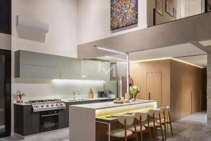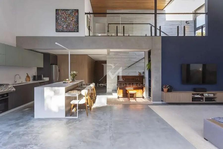 A área social foi concebida em conceito aberto, com cozinha americana integrada à sala, criando um espaço fluido e acolhedor. O pé-direito elevado e o teto com abertura zenital favorecem a entrada de luz natural, enquanto o projeto luminotécnico valoriza cada ambiente. A área gourmet com churrasqueira estilo parrilla amplia as possibilidades de convivência, conectando-se à área externa com jacuzzi e deck de madeira.