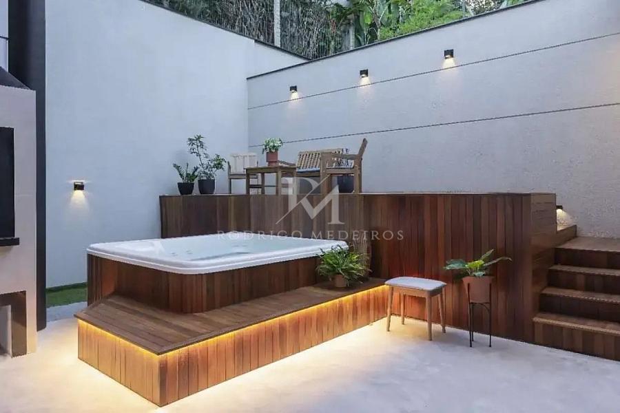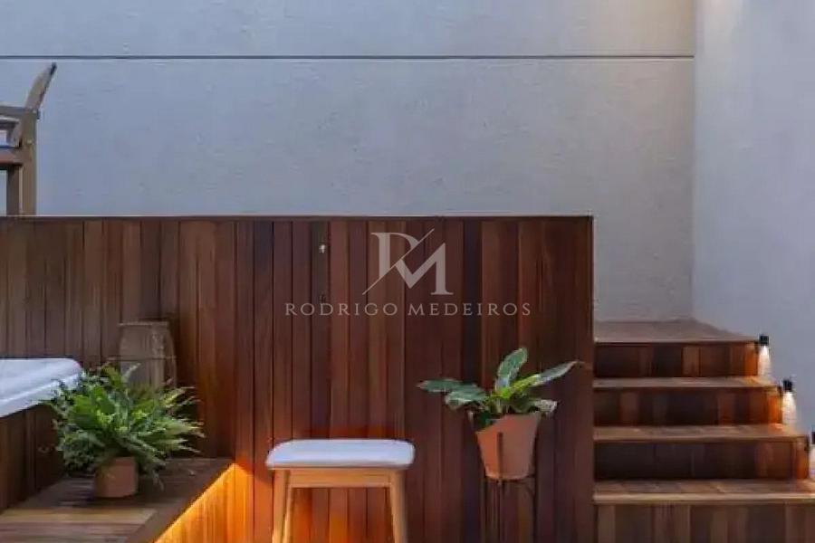 A área externa complementa a experiência da casa com um espaço garden com grama sintética e árvores frutíferas, criando um ambiente agradável e funcional. Um dos grandes diferenciais é o estúdio musical com isolamento acústico, que também pode ser adaptado como dormitório adicional, ateliê ou escritório.