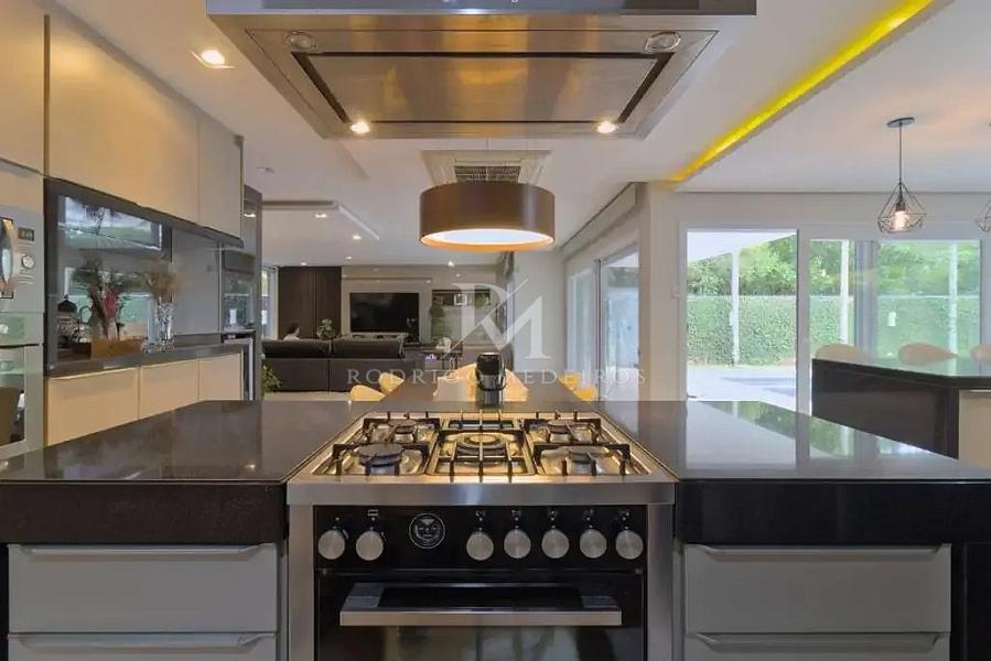 Implantada em um terreno de 640m², com 429m² de área privativa, a casa se destaca por sua arquitetura marcante e soluções modernas. Logo na entrada, o pé-direito duplo no hall imprime imponência e luminosidade, enquanto os acabamentos em inox e a marcenaria planejada reforçam o cuidado em cada detalhe.