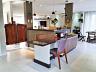 O living reúne sala de estar, jantar, bar, cozinha e espaço gourmet em um único ambiente amplo e acolhedor, com projeto de iluminação que valoriza os detalhes. Grandes aberturas em PVC, persianas automatizadas e acabamentos em gesso e madeira de demolição reforçam o estilo contemporâneo da residência.