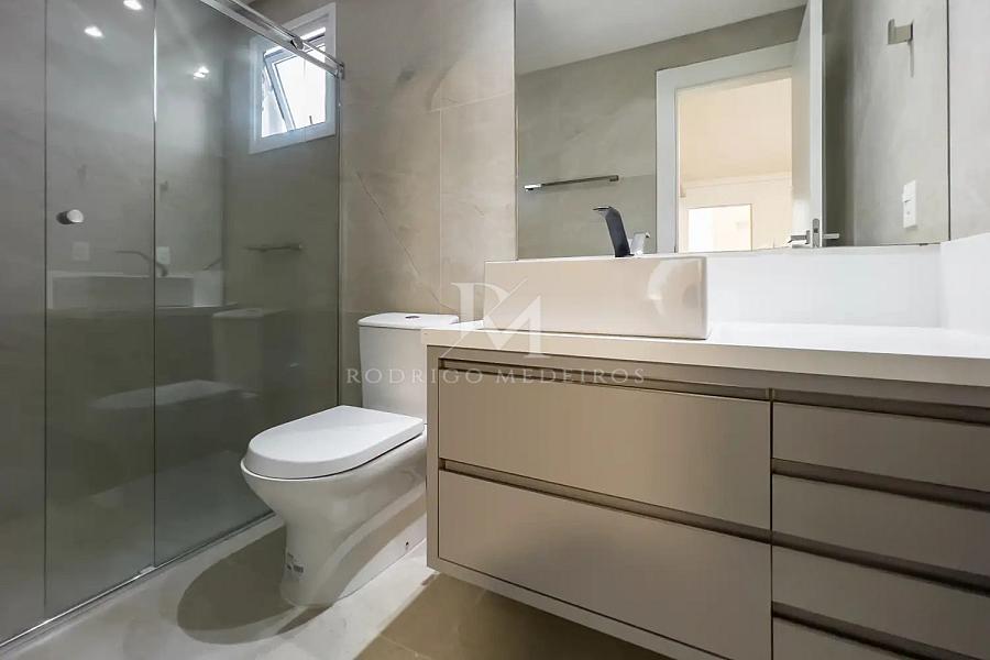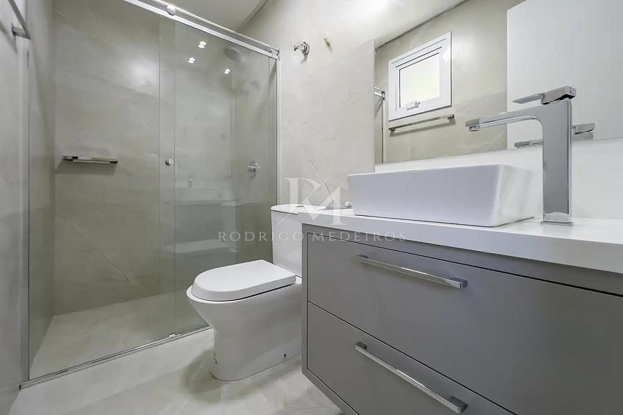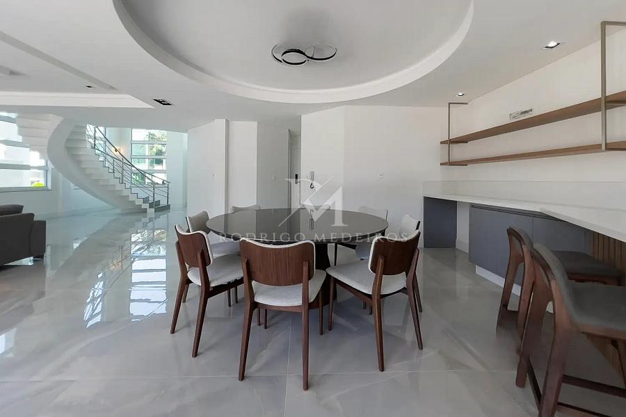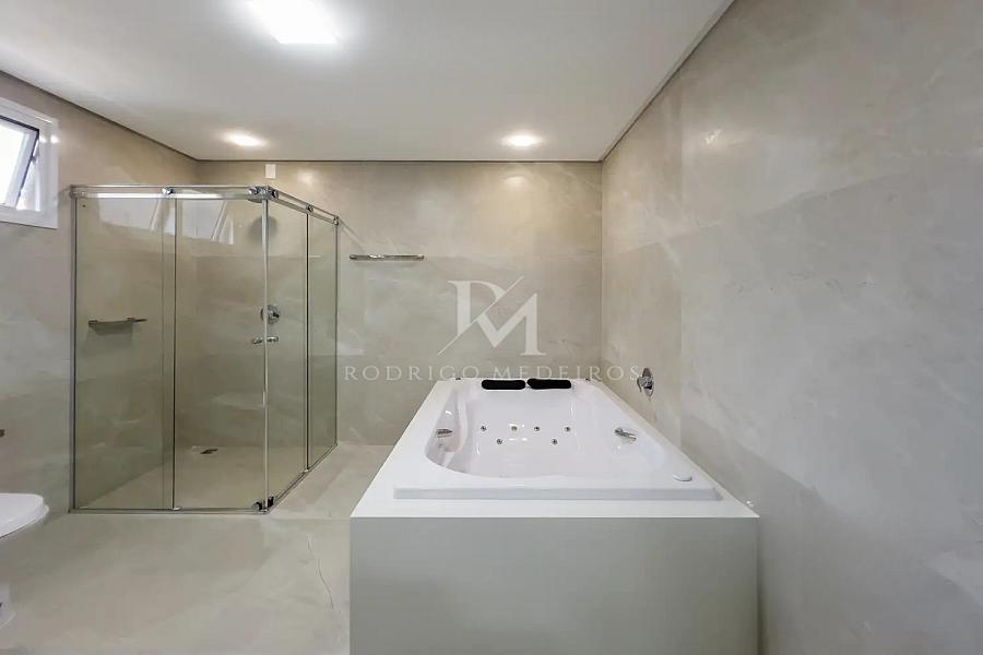 Na área íntima, o imóvel conta com cinco suítes, todas climatizadas, proporcionando privacidade e comodidade para moradores e convidados. A suíte máster se destaca pela presença de banheira de hidromassagem, criando um ambiente voltado ao relaxamento.
