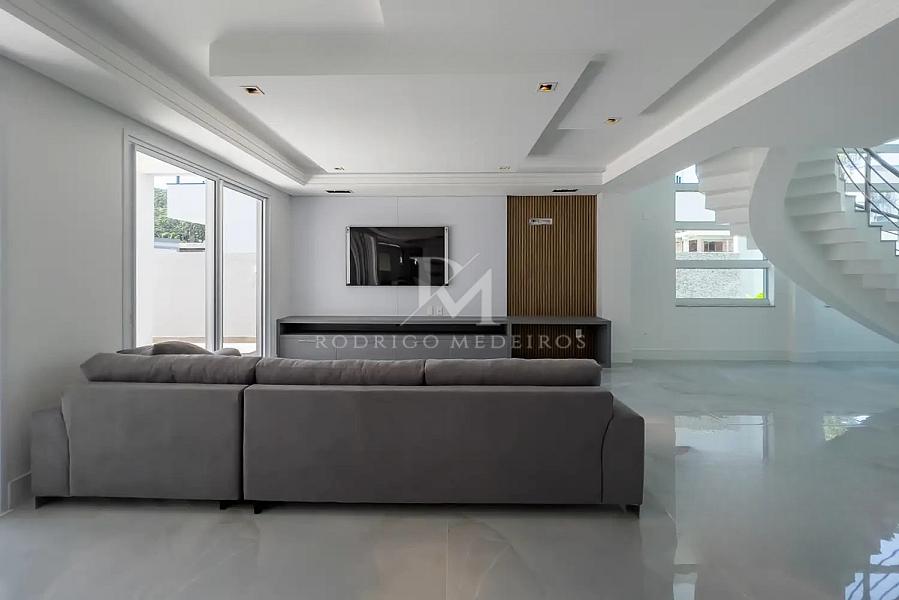 Com 400 m² de área privativa em um terreno de 450 m², a casa apresenta uma planta bem resolvida, com ambientes amplos e integrados que favorecem a convivência. O living conecta sala de estar e jantar de forma fluida, criando um espaço central elegante e funcional, integrado à cozinha e ao ambiente gourmet.